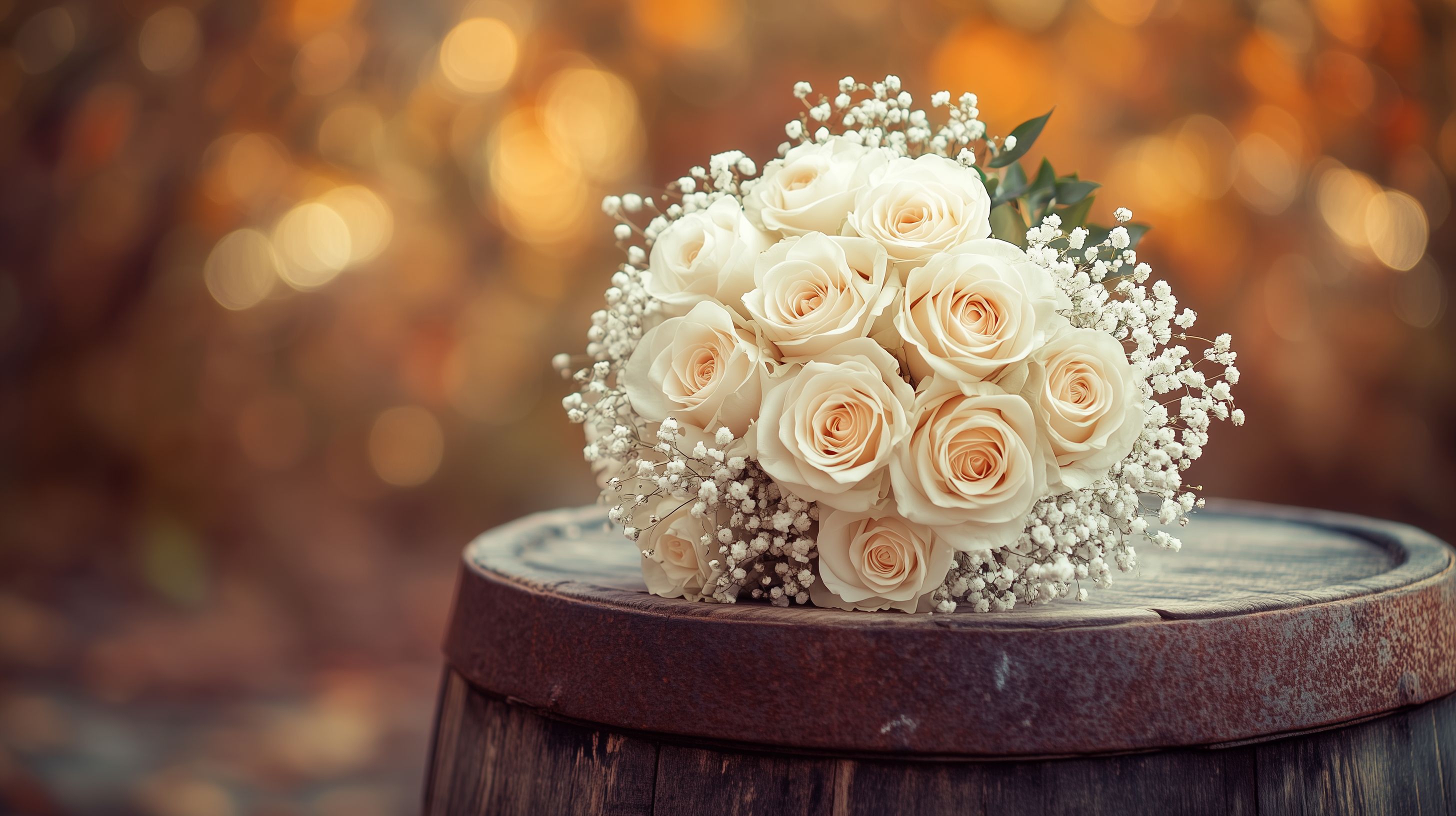 Das Foto zeigt einen wunderschönen Brautstrauß aus weißen Rosen, eingebettet in eine warme, goldene Bokeh-Atmosphäre. Der Strauß ist auf einem rustikal aussehenden Holzstück platziert, was dem Bild eine natürliche, stimmungsvolle Ästhetik verleiht. Die zarten Rosen sind mit kleinen Schleierkraut-Blüten kombiniert, die dem Arrangement eine leichte, zarte Eleganz verleihen. Dieses Stockfoto eignet sich ideal für Hochzeitseinladungen, Grußkarten, Blogs und Social-Media-Beiträge rund um Liebe, Romantik und Festlichkeiten. Das Bild ist in hoher Auflösung verfügbar und unter einer Creative-Commons-Lizenz kostenlos nutzbar.