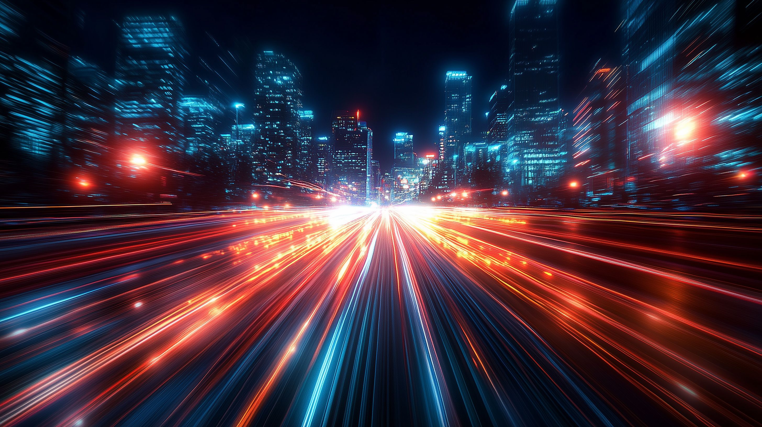 Dieses beeindruckende Foto zeigt die Energie und Dynamik einer Großstadt bei Nacht. Die Perspektive ist auf die Fahrbahn gerichtet, was den Eindruck von enormer Geschwindigkeit und Bewegung vermittelt. Helle Lichtspuren von Fahrzeugen ziehen sich diagonal durch das Bild, während im Hintergrund die beleuchteten Wolkenkratzer der Skyline stehen. Die Farbpalette in Blau-, Rot- und Orangetönen erzeugt eine faszinierende, fast futuristische Atmosphäre. Dieses hochauflösende Stockfoto eignet sich hervorragend für Anwendungen wie Blog-Beiträge, Newsletter-Illustrationen, Social-Media-Posts oder Werbematerial, bei denen eine moderne, urbane und technologisch anmutende Ästhetik gewünscht ist. Das Bild steht unter einer Creative-Commons-Lizenz zur freien Nutzung zur Verfügung.
