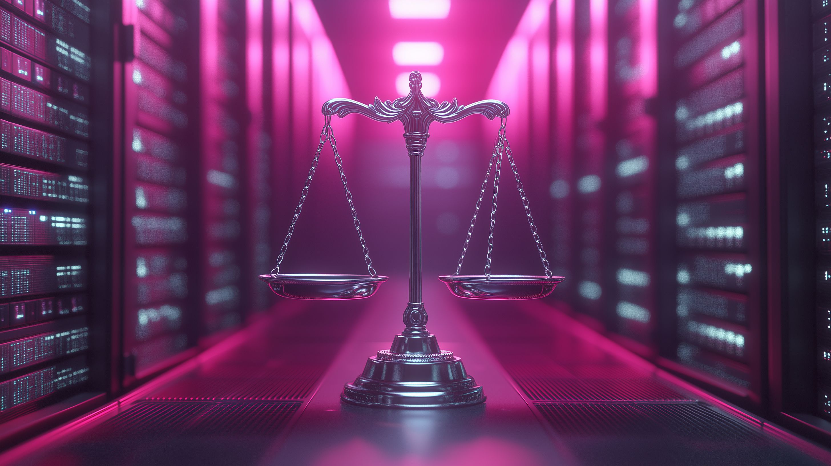 Dieses digitale 3D-Rendering zeigt eine symbolische Waage der Gerechtigkeit in einem modernen Rechenzentrum. Die Waagschalen schweben in einem lila-neonbeleuchteten Korridor mit Serverregalen im Hintergrund, was die Verbindung zwischen Recht, Technologie und Datensicherheit suggeriert. Das Bild vermittelt ein Konzept von digitaler Gerechtigkeit, Transparenz und Fairness im Umgang mit sensiblen Informationen und Daten. Es eignet sich hervorragend als kostenloses Stockfoto für Beiträge zu Themen wie Cybersicherheit, Rechtssystem, Digitalisierung und Unternehmensführung. Das hochauflösende Bild steht unter einer Creative-Commons-Lizenz zur freien Verwendung zur Verfügung.
