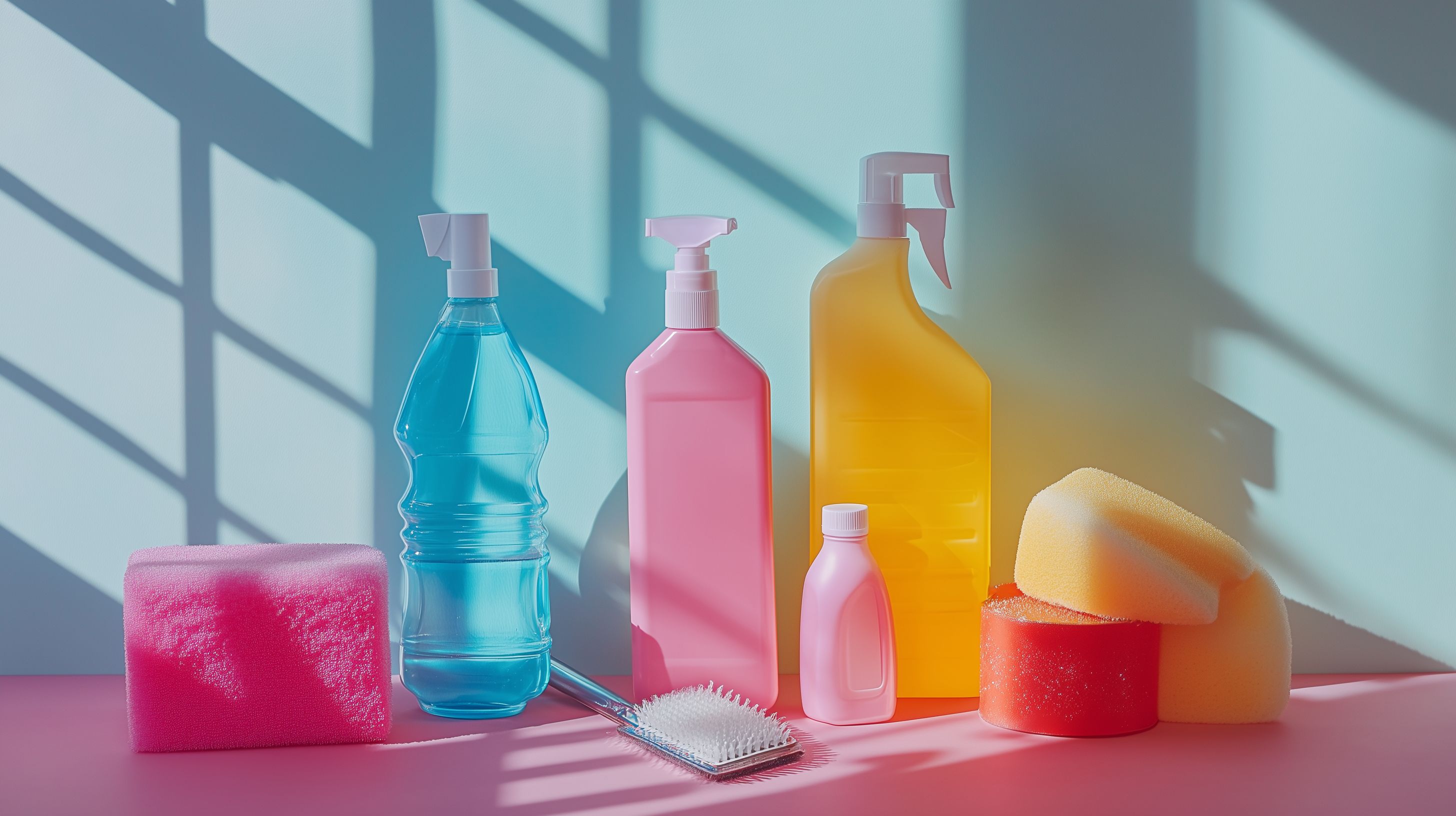 Dieses Foto zeigt eine Komposition von verschiedenen Reinigungsprodukten, die in stimmungsvolles Sonnenlicht getaucht sind. Im Vordergrund sehen wir eine Flasche mit blauem Reinigungsspray, eine rosa Sprühflasche und eine gelbe Flasche mit Schwammaufsatz. Dazu kommen ein pinkfarbener Schwamm und ein orangenes Mikrofasertuch. Die Anordnung der Produkte und die seitliche Beleuchtung erzeugen einen ästhetischen, fast minimalistischen Eindruck, der sich gut für Werbe- oder Blogbeiträge zum Thema Reinigung und Haushalt eignen würde. Dieses hochauflösende Stockfoto steht unter der Creative Commons-Lizenz zur kostenlosen Verwendung bereit.