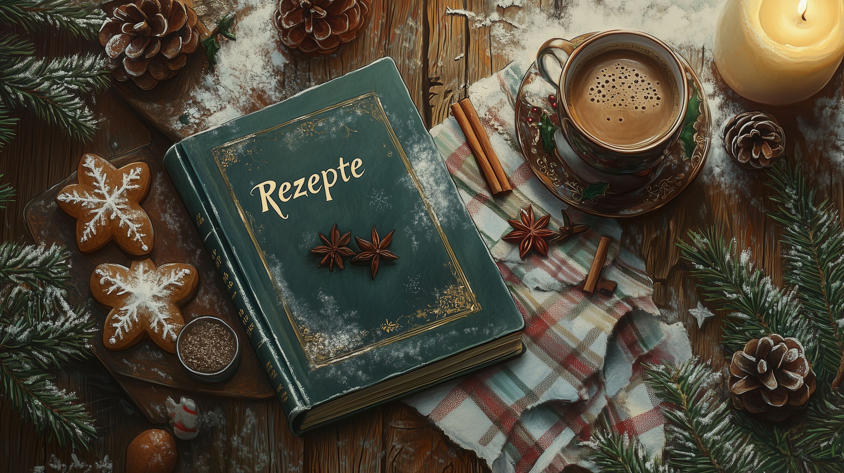 Dieses gemütliche Foto zeigt ein altes Rezeptbuch, umgeben von winterlichen Dekorationen wie Tannenzweigen, Zapfen und Lebkuchen. Eine dampfende Tasse Tee sowie Gewürze wie Zimt und Sternanis verleihen der Szene eine weihnachtliche Atmosphäre. Die rustikale Holzoptik und die warmen Farbtöne schaffen eine einladende und behagliche Stimmung, die perfekt für weihnachtliche Backaktionen, Rezeptsammlungen oder Geschenkideen geeignet ist. Dieses kostenlose Stockfoto in hoher Auflösung unter Creative-Commons-Lizenz lässt sich ideal für Blogs, Newsletter oder Werbematerialien zum Thema Weihnachten, Kochen und Backen verwenden.