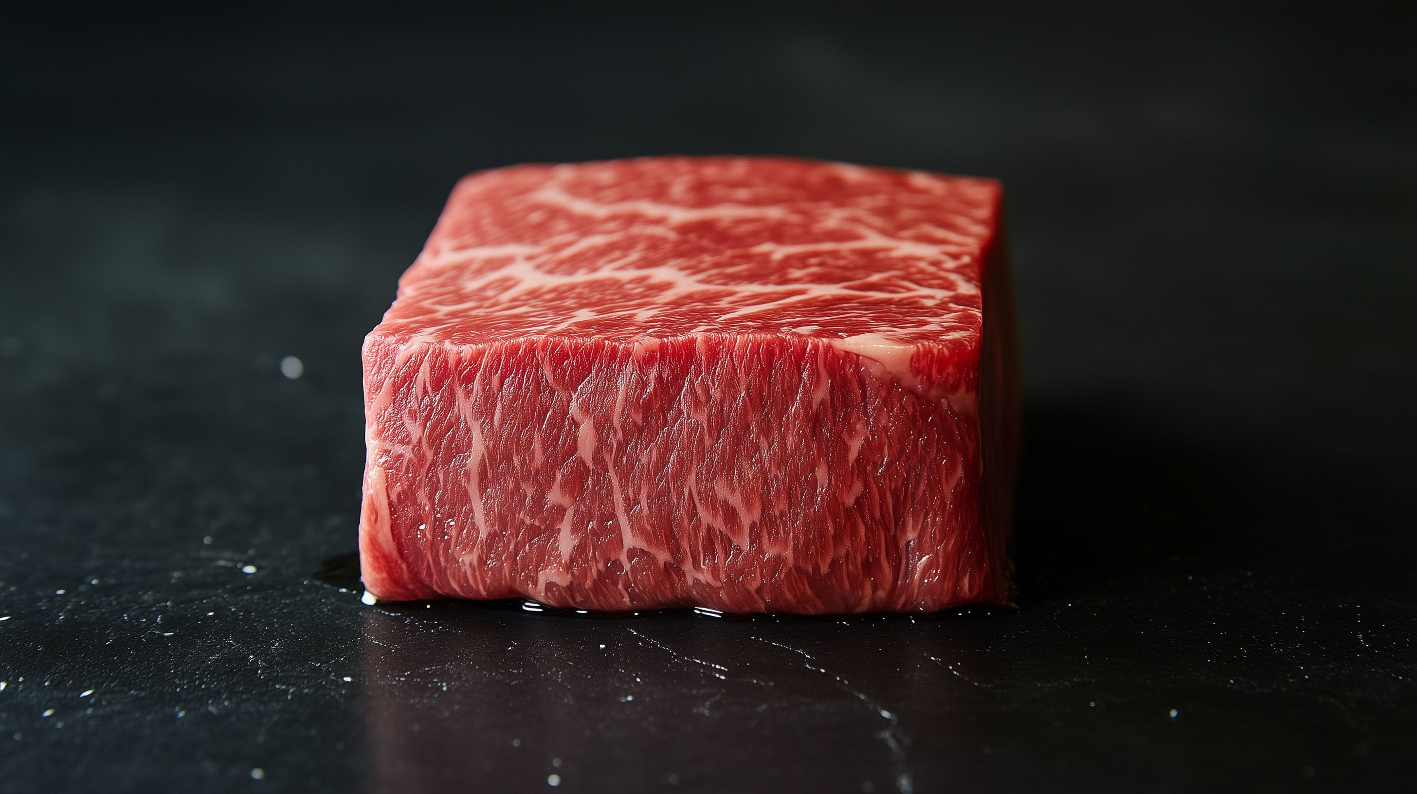 Dieses Foto zeigt ein Stück frisches, hochwertiges japanisches Wagyu-Rindfleisch vor einem dunklen Hintergrund. Das Fleisch hat eine intensive rote Farbe und eine marmorierte Struktur, die typisch für Wagyu-Rind ist. Auf der Oberfläche sind kleine Wassertropfen zu sehen, die dem Bild eine natürliche, frische Optik verleihen. Das Foto eignet sich hervorragend für den Einsatz in Rezepten, Kochbüchern, auf Lebensmittel-Websites oder in Werbekampagnen für hochwertige Fleischprodukte. Als kostenloses Stockfoto in hoher Auflösung und unter Creative-Commons-Lizenz kann es flexibel genutzt werden.