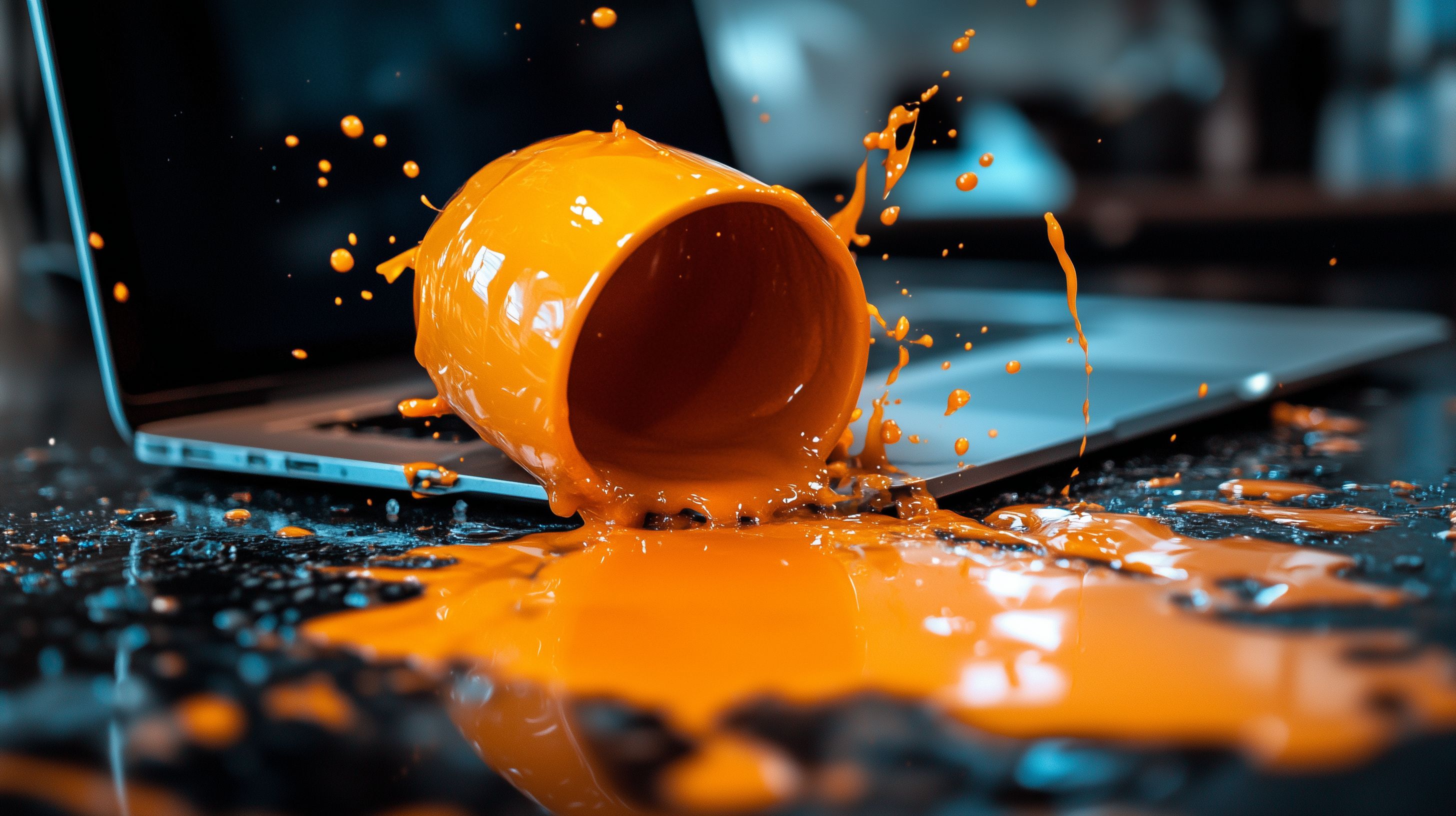 Dieses Hochauflösungsfoto zeigt eine verschüttete, orangefarbene Tasse, deren Inhalt sich über einen Laptop ergießt. Das Bild vermittelt einen Eindruck von Chaos und Unordnung, wie es bei einem solch unerwarteten Zwischenfall entstehen kann. Das Foto wäre ideal für die Verwendung in Blogbeiträgen, Social-Media-Posts oder Werbematerial zum Thema digitale Technologie, Büroarbeit oder unvorhergesehene Zwischenfälle am Arbeitsplatz. Als kostenloses Stockfoto unter Creative-Commons-Lizenz ist es für eine Vielzahl an Projekten einsetzbar.