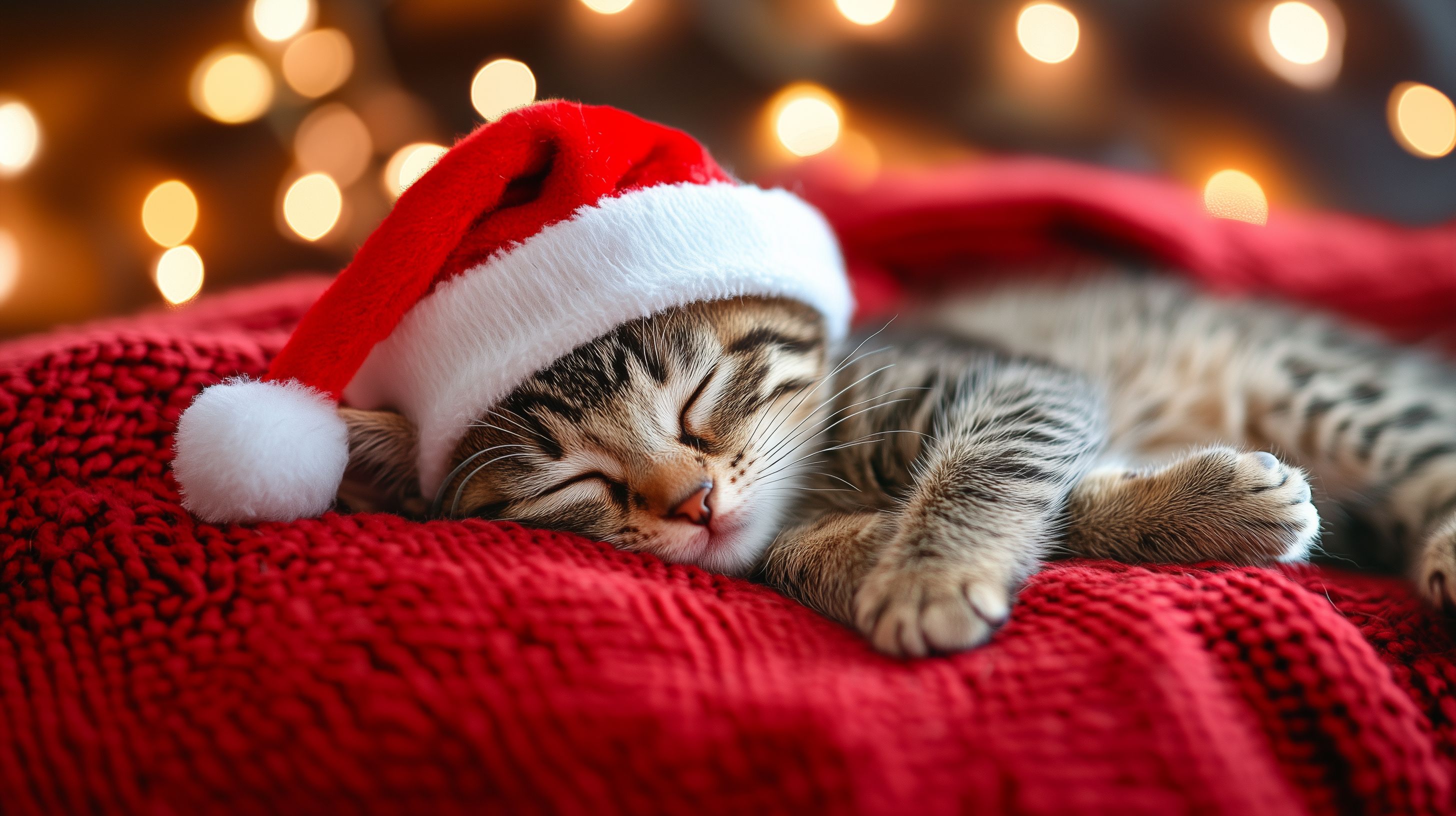 Das Bild zeigt ein schlafendes, getigertes Kätzchen, das eine rote Weihnachtsmütze trägt und auf einer roten, gemütlichen Decke kuschelt. Der Hintergrund ist mit einer stimmungsvollen, bokehartigen Beleuchtung versehen, was dem Bild einen festlichen, gemütlichen Charakter verleiht. Dieses Foto eignet sich hervorragend für die Verwendung in Weihnachtsdekorationen, Grußkarten, Blogbeiträgen oder sozialen Medien rund um die Feiertage. Es ist ein kostenloses Stockfoto in hoher Auflösung und unter der Creative-Commons-Lizenz verfügbar.