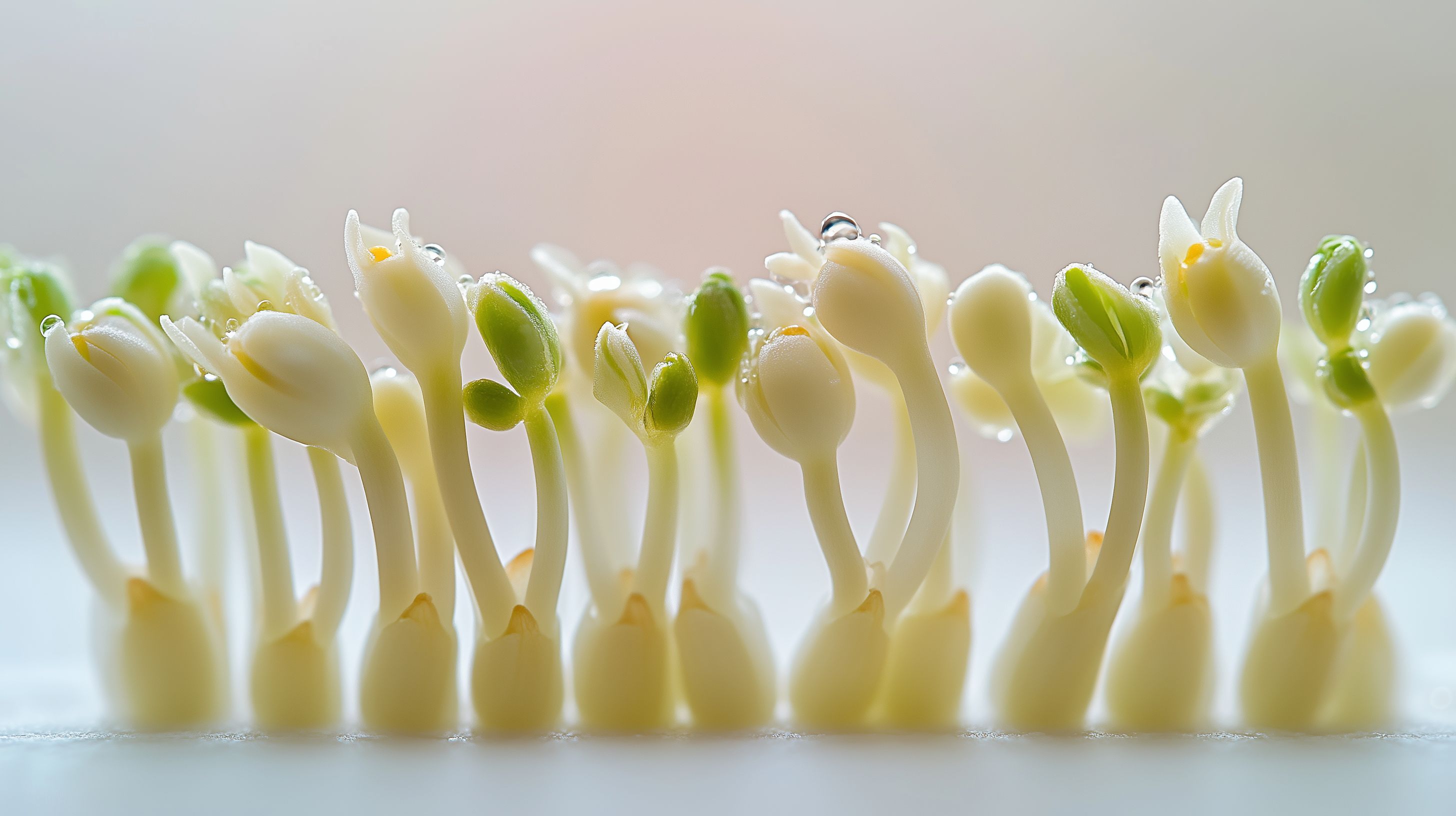 Dieses Stockfoto zeigt eine Nahaufnahme von frischen, saftigen Bohnenkeimsprosse mit zarten grünen Blättern und kleinen Wassertropfen. Die Sprossen sind weiß-grün und vor einem hellen, verschwommenen Hintergrund platziert, was den Fokus auf die Details der Pflanze lenkt. Das Bild vermittelt Frische, Natürlichkeit und Gesundheit. Es eignet sich hervorragend für Blogs, Newsletter oder Social-Media-Posts zum Thema Ernährung, Landwirtschaft oder gesunde Lebensmittel. Als kostenloses Stockfoto mit hoher Auflösung und Creative-Commons-Lizenz kann es vielseitig eingesetzt werden.