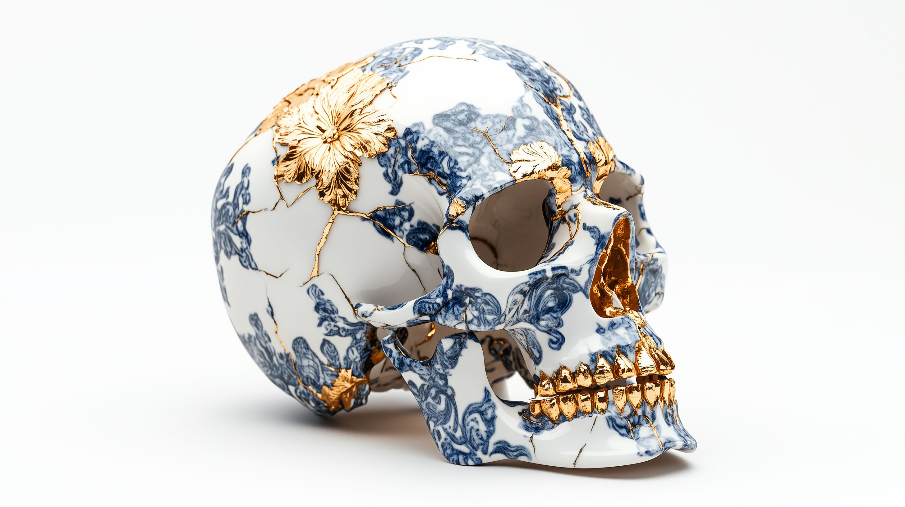 Das Bild zeigt eine einzigartige und dekorative Porzellanvase in Form eines menschlichen Schädels. Der Schädel ist kunstvoll mit einem blauen, floralen Muster verziert, das an historische Porzellantradition erinnert. Der Schädel ist in einem weißen Grundton gehalten und hat goldene Akzente, was dem Objekt einen luxuriösen und exklusiven Charakter verleiht. Diese Schädelform mit der Blumenverzierung ist ein faszinierendes und außergewöhnliches Designobjekt, das sich hervorragend als Eyecatcher in Fotostudios, für Werbematerialien oder zur Dekoration in sozialen Medien und Newslettern eignet. Das hochauflösende Foto des kostenlosen Stockfotos steht unter einer Creative-Commons-Lizenz zur Verfügung.
