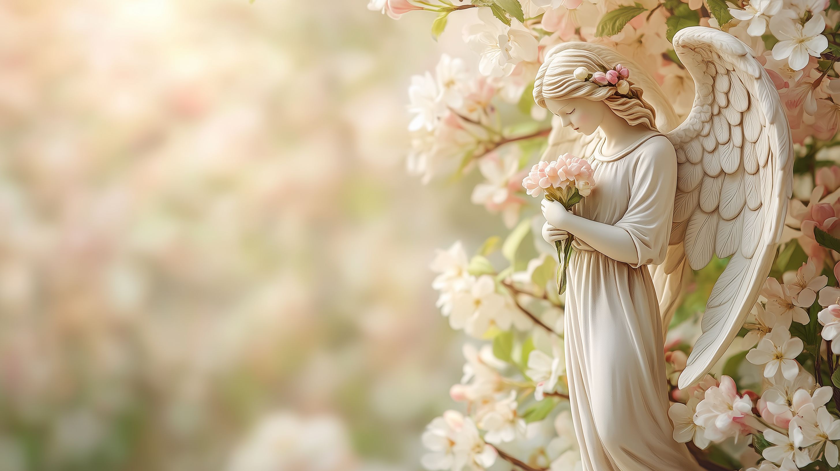 Dieses Foto zeigt eine anmutige Engelsfigur, die von einer Blütenpracht umgeben ist. Die Figur ist in einem weißen Gewand gekleidet und trägt zarte Flügel. Sie hält eine kleine Blumengarbe in ihren Händen und blickt mit gesenktem Kopf nach unten, als wäre sie in Gedanken versunken. Die Szenerie ist von einer warmen, friedlichen Atmosphäre erfüllt, die durch das weiche Licht und die zarten Farbtöne der Blumen verstärkt wird. Dieses Stockfoto eignet sich hervorragend für den Einsatz in Blogs, Newslettern, sozialen Medien oder auch für werbliche Zwecke, wo eine spirituell-romantische Stimmung gewünscht ist. Die hochauflösende Datei steht unter einer Creative-Commons-Lizenz kostenlos zur Verfügung.