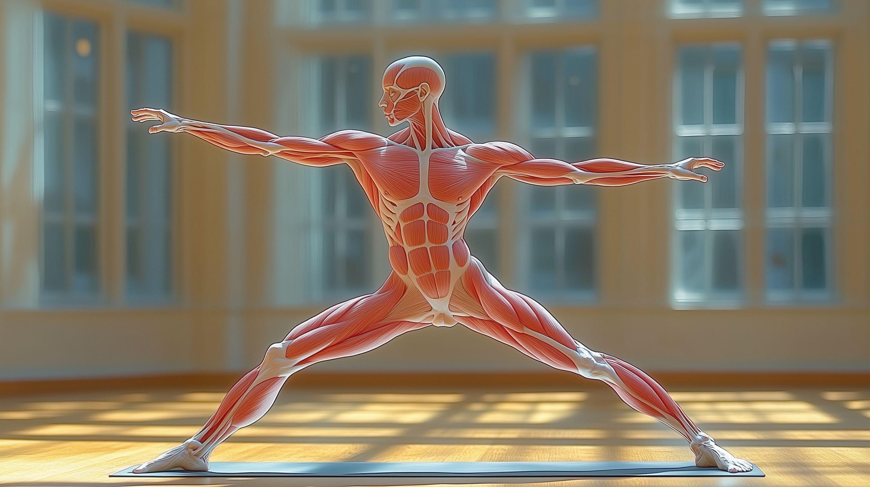 Dieses Bild zeigt ein dreidimensionales Modell des menschlichen Muskelsystems in einer Yoga-Pose. Die Muskeln sind detailliert dargestellt und in leuchtenden Rottönen hervorgehoben, was ihre Struktur und Funktion verdeutlicht. Das Modell ist vor einem hellen, verschwommenen Hintergrund platziert, der den Fokus auf die Anatomie lenkt. Dieses Stockfoto eignet sich hervorragend für die Verwendung in medizinischen, gesundheitlichen oder fitnessorientierten Kontexten, wie etwa Blogbeiträge, Newsletter oder Social-Media-Postings. Es ist in hoher Auflösung verfügbar und unter einer Creative-Commons-Lizenz nutzbar.