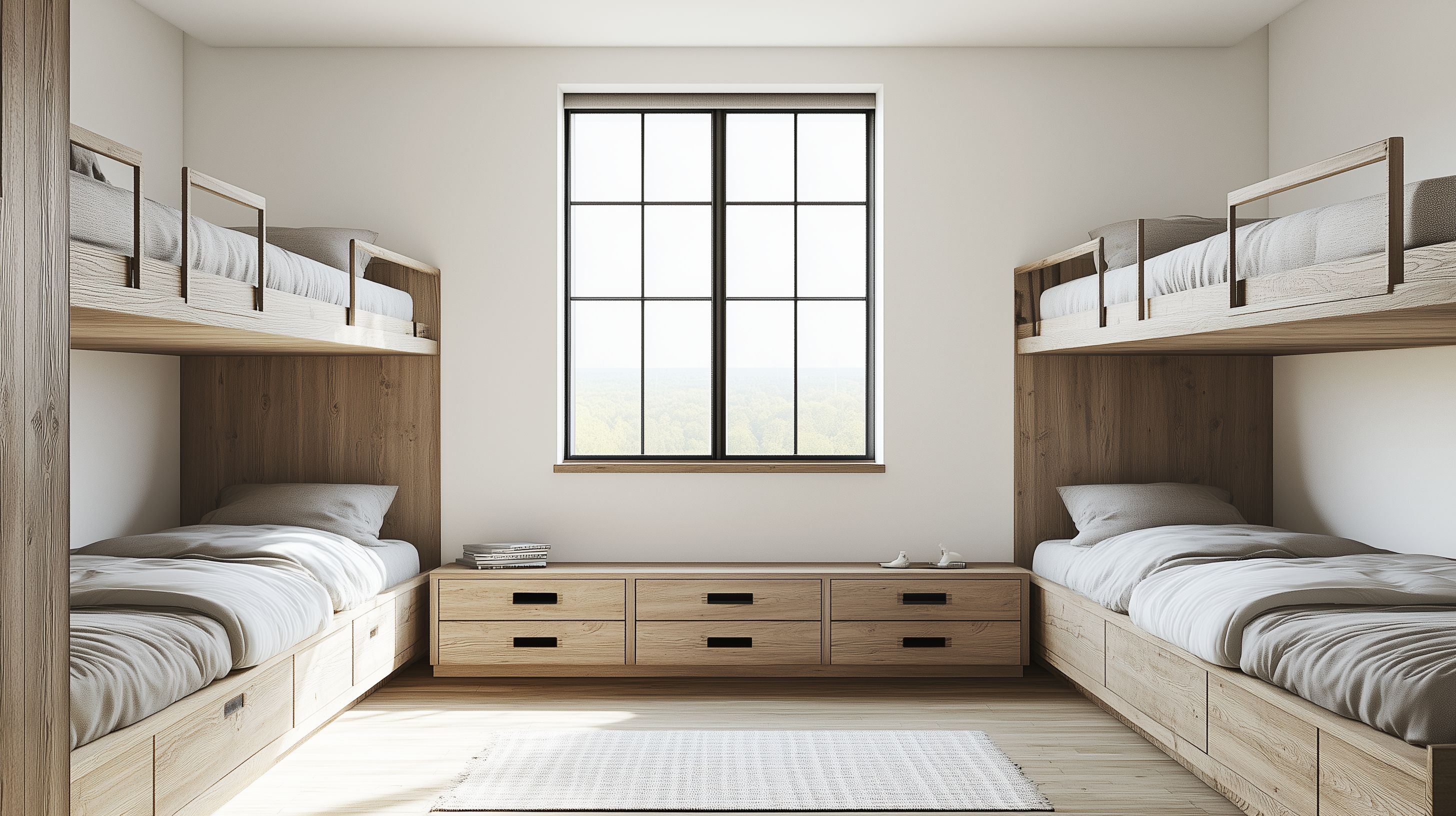 Das Bild zeigt einen minimalistisch gestalteten Schlafbereich in einem hellen Hostel. Der Raum ist geprägt von Holzmöbeln in warmen Naturtönen und großen Fenstern, die viel Tageslicht hereinlassen. Im Mittelpunkt stehen zwei Etagenbetten mit Bettkästen, die für eine effiziente Raumnutzung sorgen. Der Teppichboden und die Textilien in gedeckten Farben schaffen eine gemütliche Atmosphäre. Dieses Foto eignet sich hervorragend für die Verwendung in Blogbeiträgen, Newslettern oder Social-Media-Kanälen rund um das Thema Innendesign, Einrichtung und nachhaltiges Wohnen. Als kostenloses Stockfoto in hoher Auflösung und unter einer Creative-Commons-Lizenz können Nutzer das Bild frei für ihre Projekte verwenden.