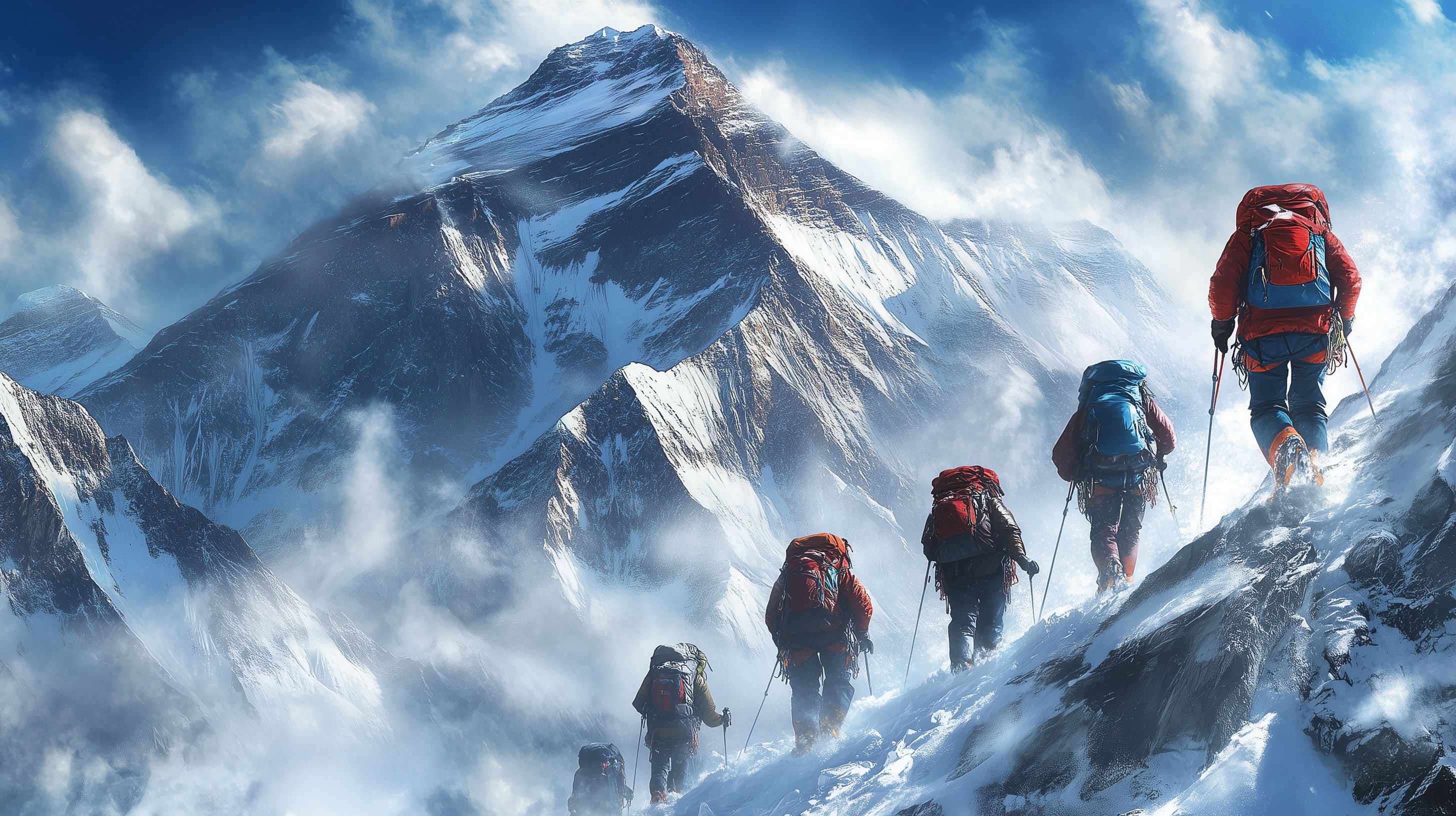 Das Foto zeigt eine Gruppe von mutigen Bergsteigern, die einen schneebedeckten Gipfel im Himalaja-Gebirge erklimmen. Die Berglandschaft ist majestätisch und imposant, mit steilen Felswänden und einer dramatischen Wolkenkulisse. Die Bergsteiger sind mit schwerer Ausrüstung auf dem Weg nach oben, ihre roten Jacken heben sich deutlich vom weißen Schnee ab. Dieses faszinierende Bild vermittelt die Herausforderung und Abenteuerlichkeit einer Bergexpedition in einer der atemberaubendsten Gebirgsregionen der Welt.