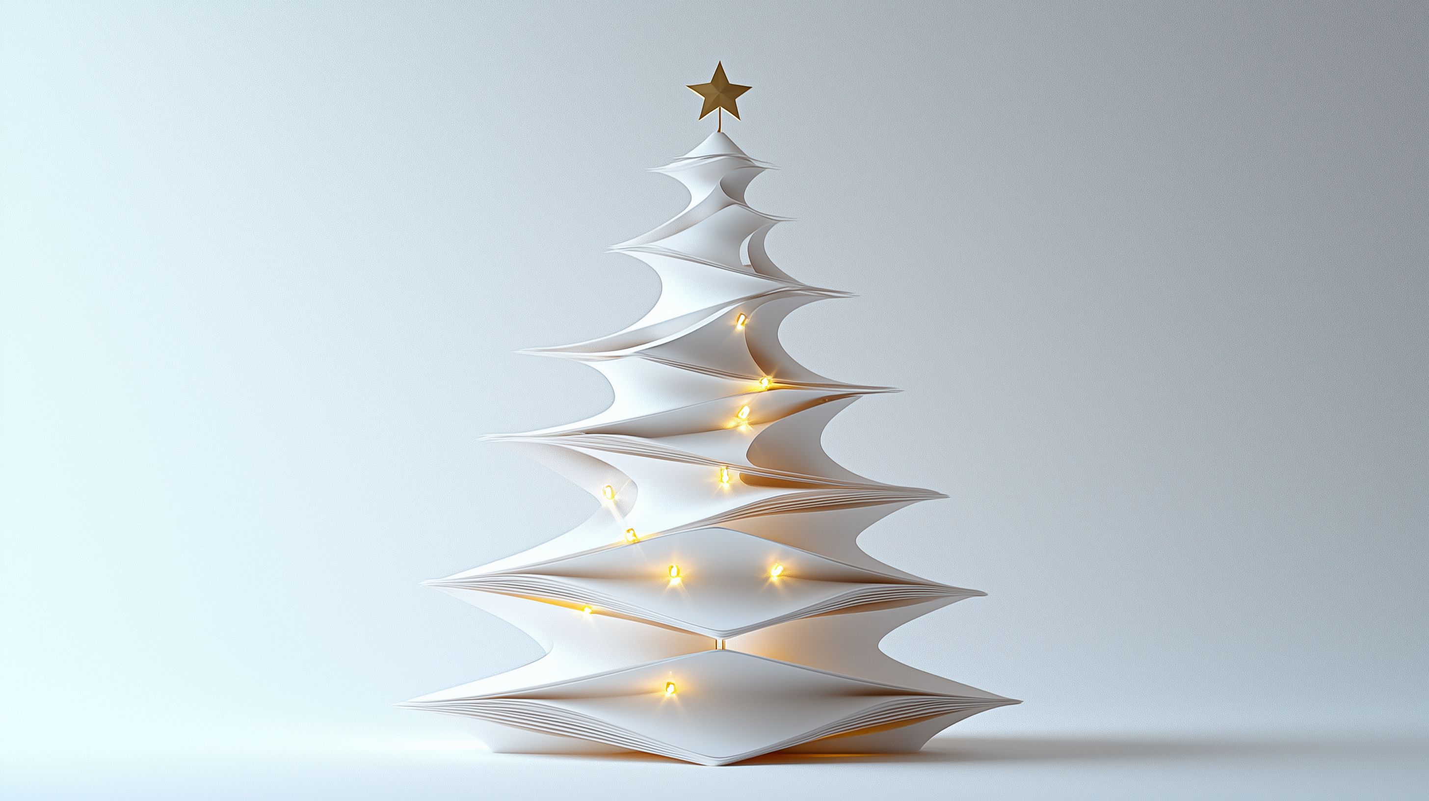 Dieses minimalistische, abstrakte Weihnachtsbaumfoto zeigt eine dreidimensionale, geometrische Komposition in Weiß und Gold. Der Baum ist aus filigranen, wellenförmigen Elementen aufgebaut, die mit goldenen Sternen und Lichterketten dekoriert sind. Die reduzierte, moderne Ästhetik verleiht dem Bild einen stilvollen, eleganten Charakter, der sich perfekt für Weihnachtsdekorationen, Grußkarten, Blogger-Posts oder Social-Media-Beiträge eignet. Als hochauflösendes Stockfoto unter Creative-Commons-Lizenz kann es kostenlos für verschiedene Zwecke genutzt werden.