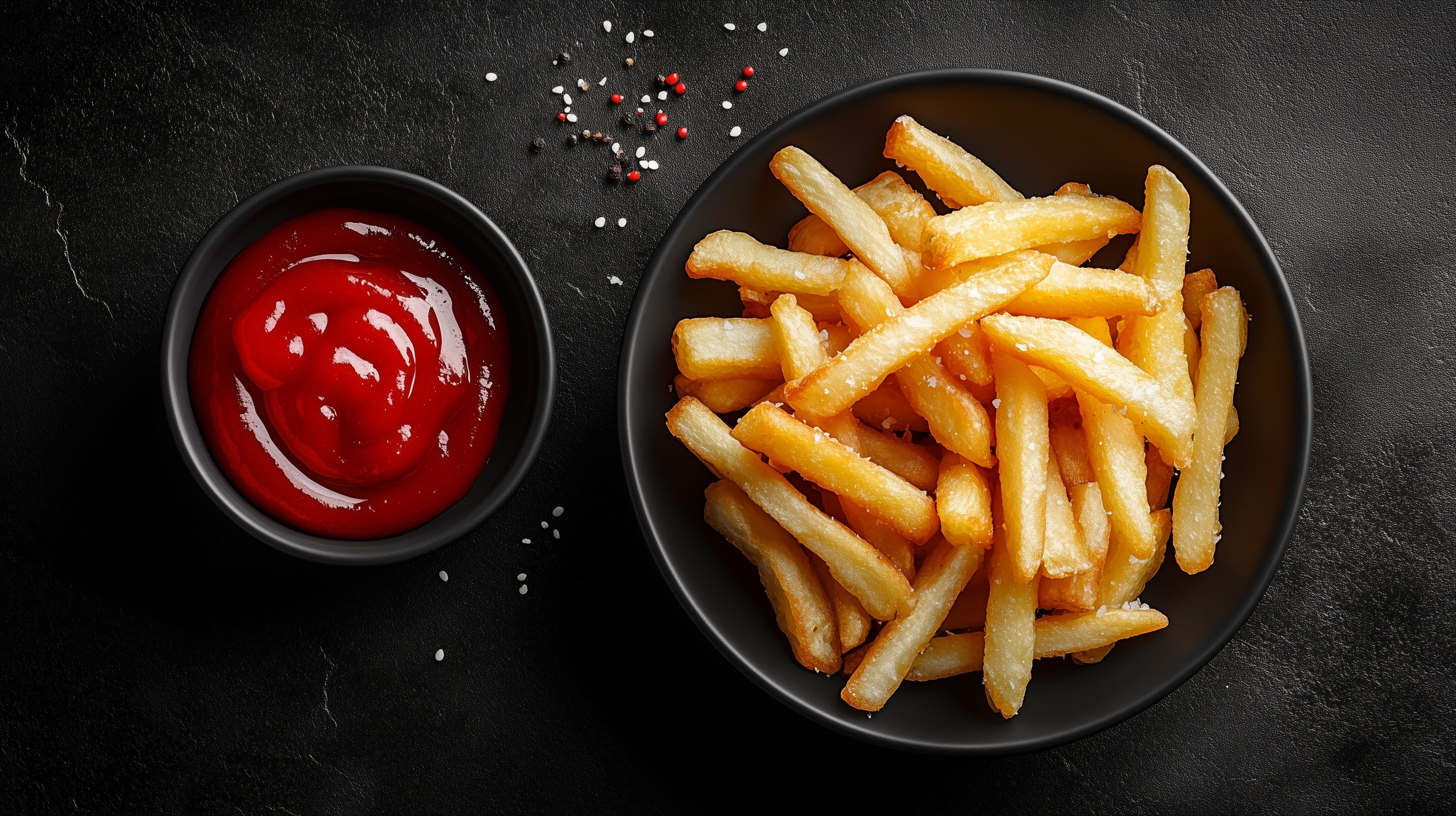 Das Bild zeigt einen Teller voller knuspriger Pommes Frites auf einem dunklen Schieferuntergrund. Neben den goldbraunen, perfekt frittierten Kartoffeln befindet sich eine Schale mit rotem Ketchup. Die Komposition ist minimalistisch und legt den Fokus ganz auf das Hauptmotiv - die appetitlichen Pommes. Die Draufsicht und die Platzierung der Elemente auf dem schwarzen Hintergrund verleihen dem Foto eine moderne, hochwertige Ästhetik. Dieses Stockfoto eignet sich hervorragend für die Verwendung in Blogbeiträgen, Newslettern oder Social-Media-Kampagnen rund um das Thema Fastfood, Imbisse und leckere Snacks. Die hohe Auflösung und Creative-Commons-Lizenz ermöglichen eine vielseitige, kostengünstige Nutzung.