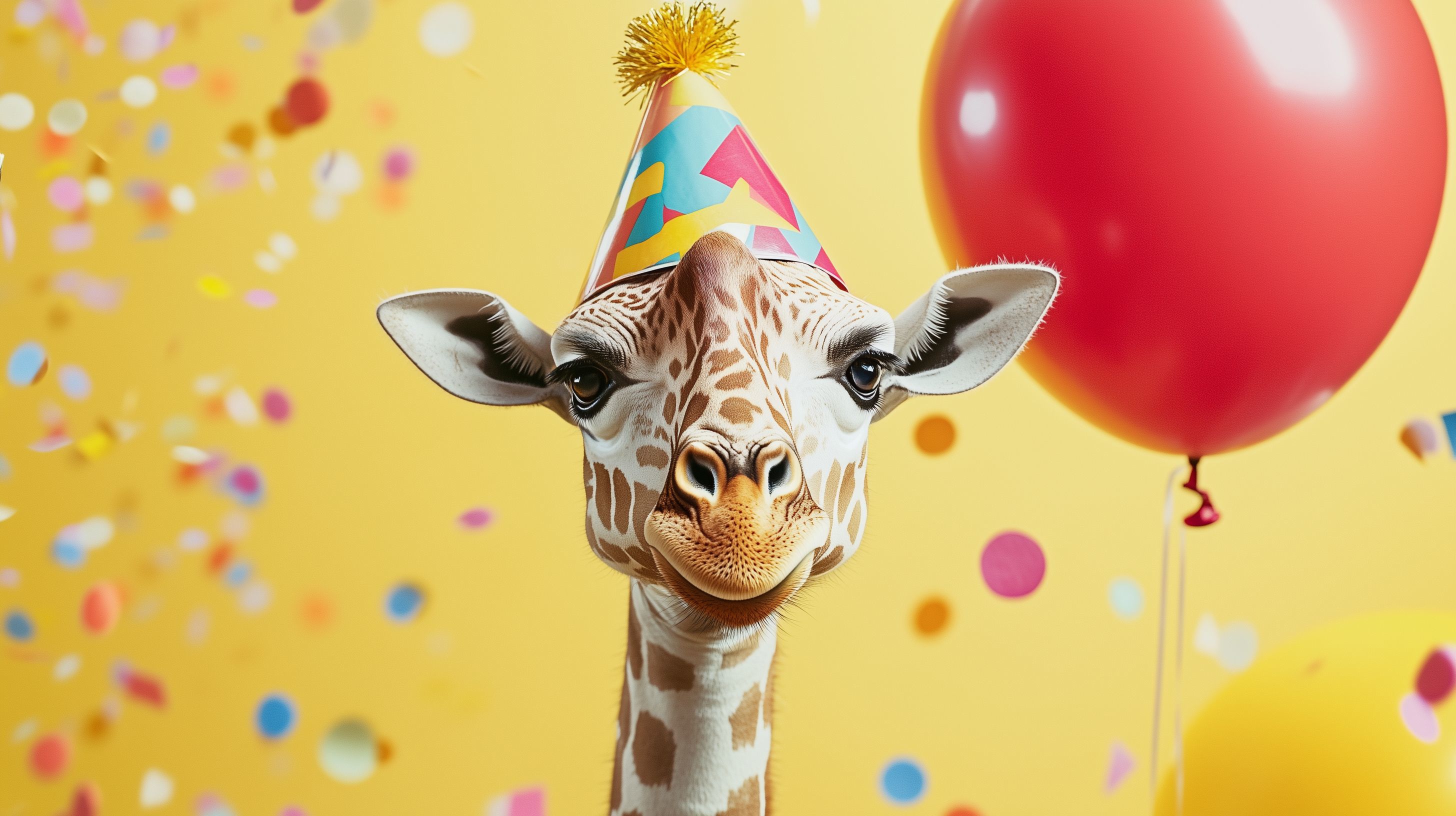 Dieses bunte und fröhliche Bild zeigt eine Giraffe, die offensichtlich ihren Geburtstag feiert. Sie trägt einen bunten Partyhut und hält einen roten Luftballon in der Luft, während sie von bunten Konfetti umgeben ist. Die Giraffe schaut direkt in die Kamera und lächelt, als würde sie sich über ihre Geburtstagsfeier freuen. Dieses Foto eignet sich perfekt als Stockfoto für verschiedene Anwendungen, wie Blog-Beiträge, Newsletter, Social-Media-Postings oder Werbematerial. Es ist hochaufgelöst und unter einer Creative-Commons-Lizenz verfügbar, sodass es kostenfrei genutzt werden kann.