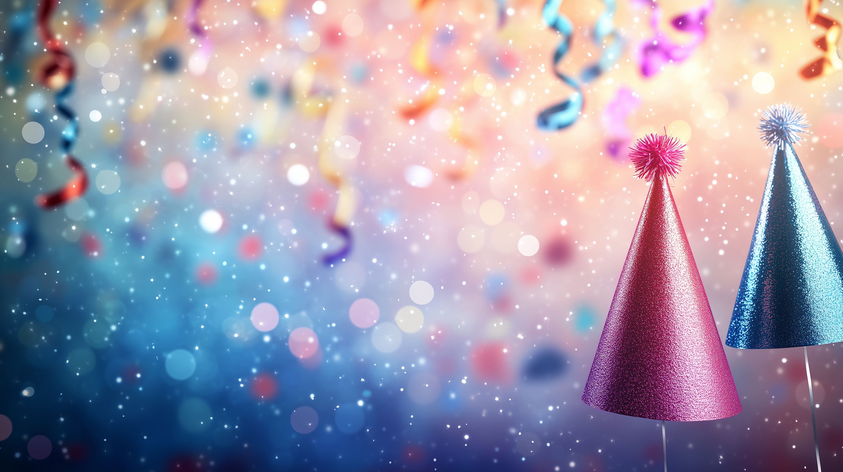 Dieses farbenfrohe und glitzernde Bild zeigt eine festliche Partyatmosphäre mit traditionellen Partyhüten in verschiedenen Farben, umgeben von funkelnden Metallicstreifen und einem Bokeh-Hintergrund in zarten Pastelltönen. Die Komposition und Farbgebung vermitteln eine Stimmung der Freude, des Feierns und der Leichtigkeit, ideal als Hintergrund für Einladungen, Werbekampagnen oder Blogbeiträge rund um Feste, Jubiläen und Veranstaltungen. Dieses kostenlose Stockfoto in hoher Auflösung steht unter einer Creative-Commons-Lizenz zur Verfügung.