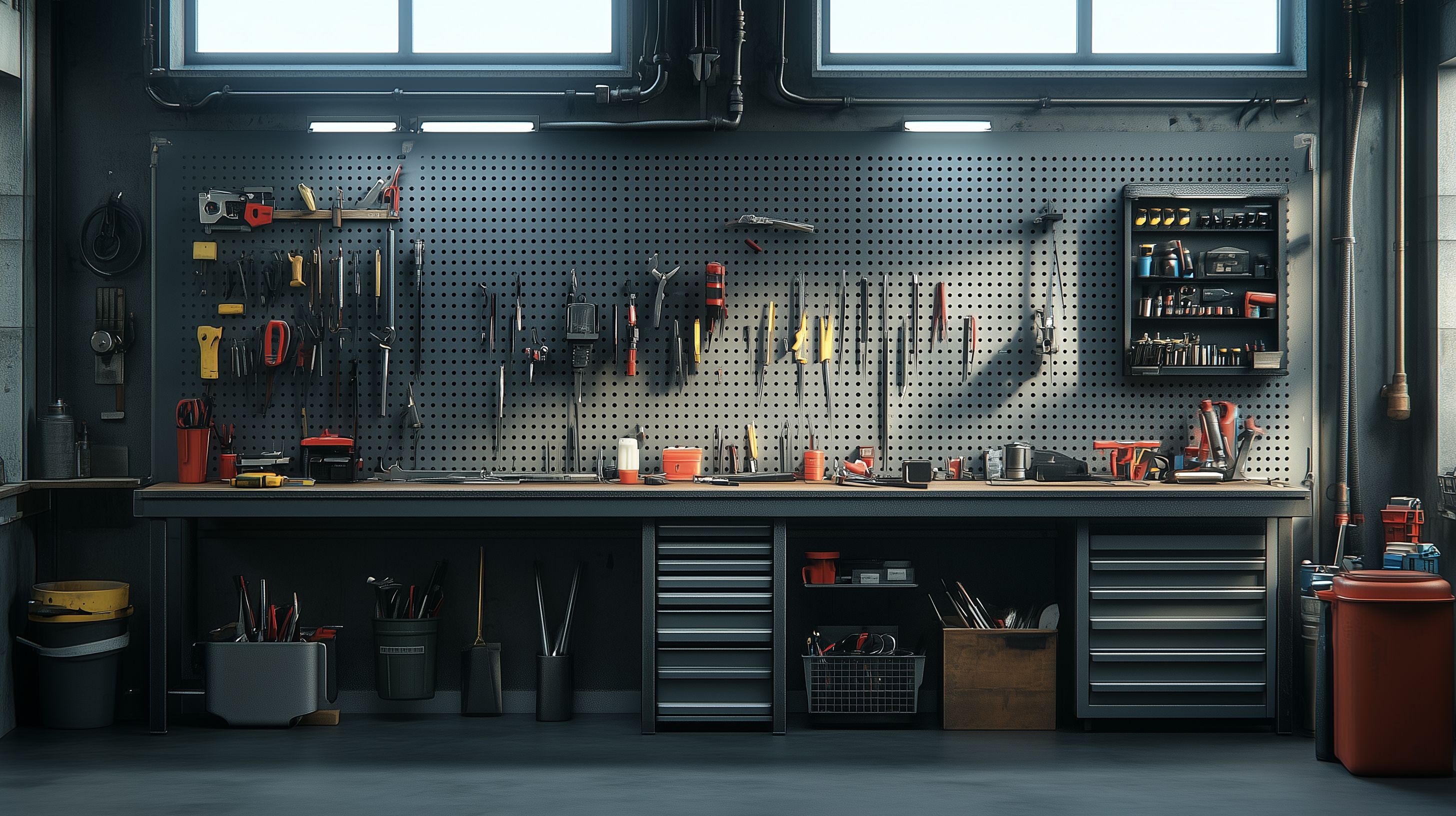 Dieses Foto zeigt eine moderne und gut organisierte Industriewerkstatt. An einer Werkbank an der Wand sind zahlreiche Werkzeuge wie Schraubenschlüssel, Zangen, Hämmer und Schraubendreher übersichtlich aufgehängt. Darunter befinden sich mehrere Schubladen und Regale, die zusätzlichen Stauraum für weitere Utensilien bieten. Das Licht fällt durch große Fenster, die eine helle und freundliche Atmosphäre erzeugen. Die Farbpalette ist überwiegend in Grautönen gehalten, was dem Raum eine professionelle und funktionale Ausstrahlung verleiht.