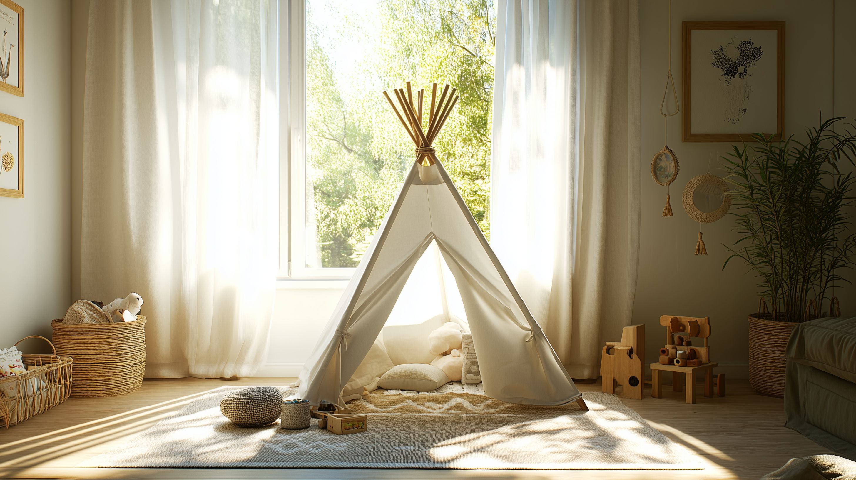 Dieses gemütliche und lichtdurchflutete Kinderzimmer mit einem Tipi-Zelt als Blickfang bietet eine ideale Umgebung für Kinder zum Spielen, Träumen und Entdecken. Das Tipi-Zelt ist mit weichen Stoffen und Kissen ausgestattet und lädt zum Kuscheln und Versteckspielen ein. Rund um das Zelt finden sich verschiedene Holzspielzeuge, die die Kreativität und Fantasie der Kinder anregen. Das Zimmer ist in hellen, natürlichen Farben gehalten und mit Accessoires wie Körben, Pflanzen und Wanddekorationen stilvoll eingerichtet. Dieses Stockfoto in hoher Auflösung eignet sich ideal für die Verwendung in Blogs, Newslettern, auf Social-Media-Kanälen oder in Werbematerialien, die eine gemütliche und ökologische Atmosphäre vermitteln wollen.