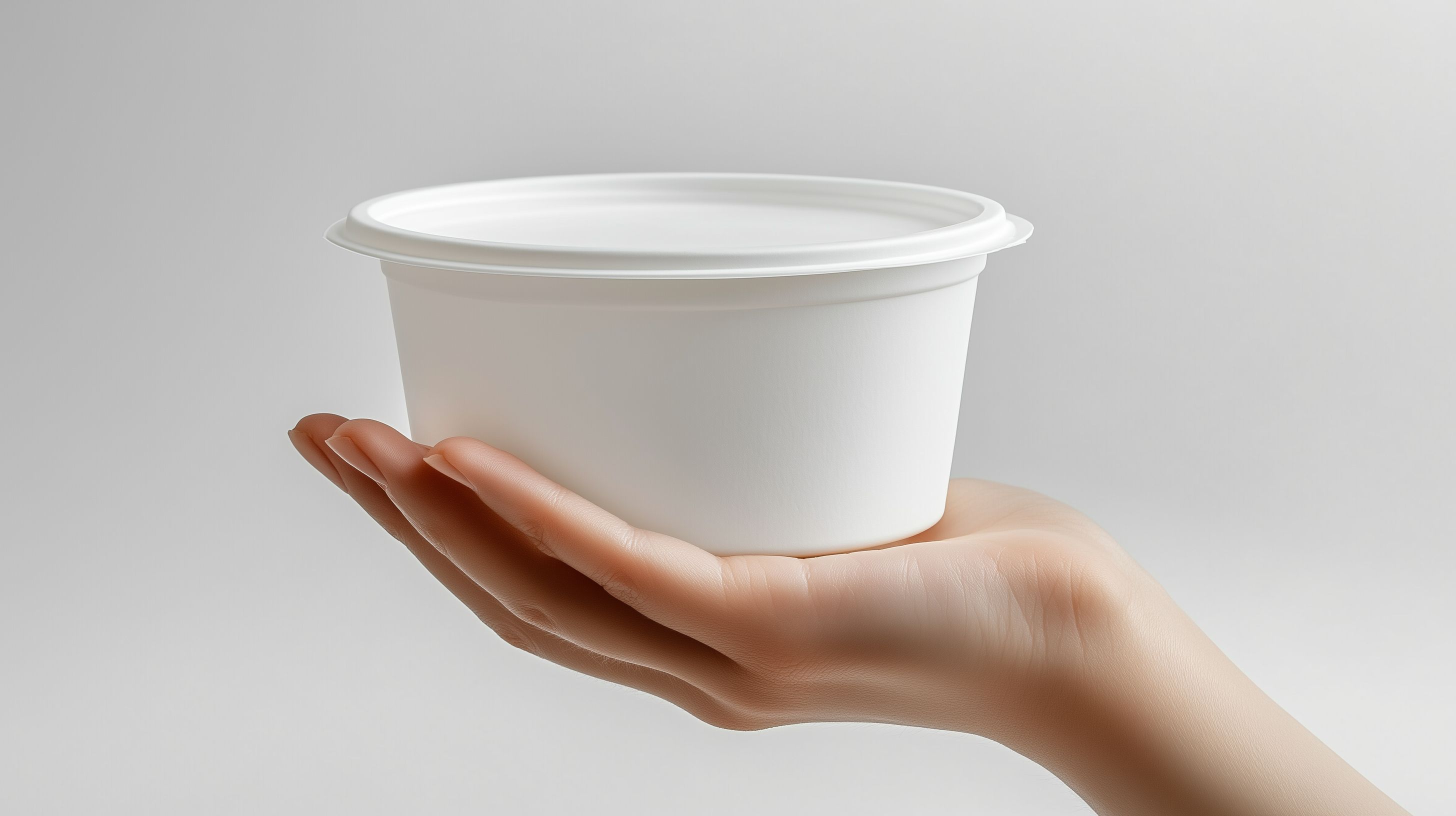 Das Bild zeigt eine weiße, kreisförmige Plastikschüssel, die in einer menschlichen Hand gehalten wird. Der Hintergrund ist einfarbig grau, wodurch die Schüssel und die Hand im Mittelpunkt der Aufmerksamkeit stehen. Die Schüssel könnte für einen Salat, Suppe oder ein anderes Gericht verwendet werden und vermittelt einen modernen, minimalistischen Eindruck. Dieses Stockfoto eignet sich hervorragend für Verwendungen in Blogs, Newslettern, sozialen Medien und Werbematerialien, bei denen ein reines, sauberes Design gefragt ist. Das hochauflösende Bild ist unter einer Creative-Commons-Lizenz frei verfügbar.