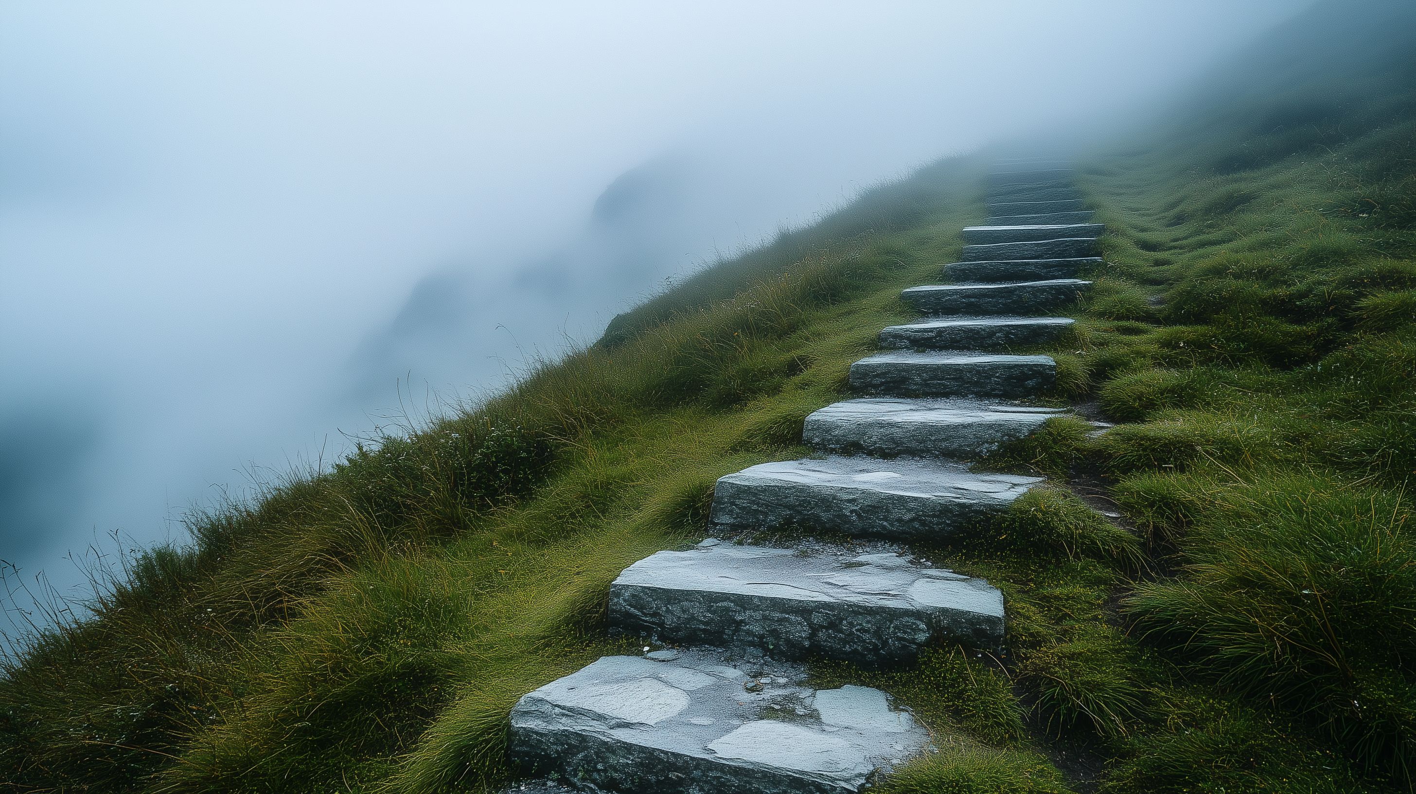 Dieses Foto zeigt einen schmalen, steinigen Pfad, der sich durch eine neblige Berglandschaft schlängelt. Der Weg führt über raue Treppen aus großen Steinen, die von üppigem, grünem Gras umgeben sind. Die Szenerie ist von dichtem Nebel umhüllt, was der Landschaft eine geheimnisvolle, mystische Atmosphäre verleiht.