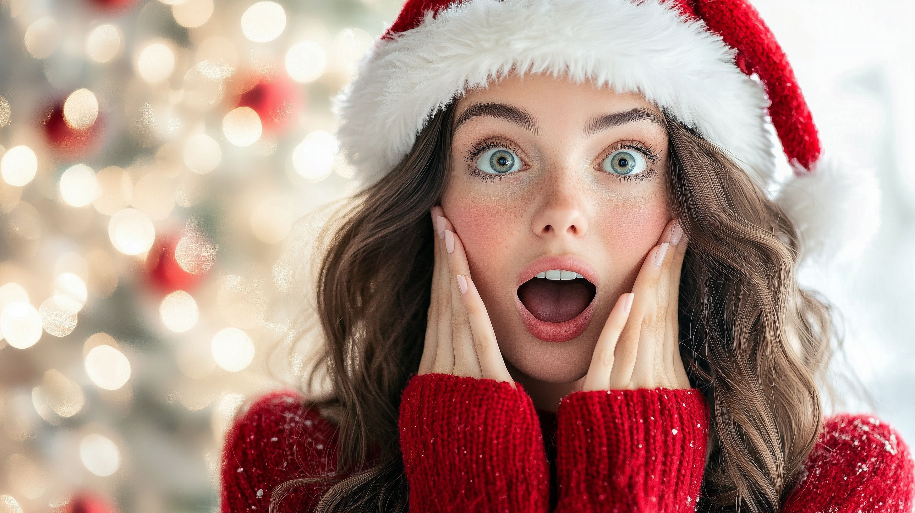 Dieses Foto zeigt eine überraschte junge Frau, die ein Weihnachtsmann-Kostüm trägt. Sie hat große Augen und einen offenen Mund, was ihren überraschten Gesichtsausdruck unterstreicht. Die Frau ist vor einem verschwommenen, festlichen Hintergrund mit Bokeh-Effekt zu sehen, was die Weihnachtsstimmung unterstreicht. Dieses hochauflösende Stockfoto eignet sich perfekt für Weihnachts-Werbekampagnen, Blogbeiträge, Social-Media-Postings oder Newsletter. Es steht unter einer Creative-Commons-Lizenz und kann kostenfrei verwendet werden.