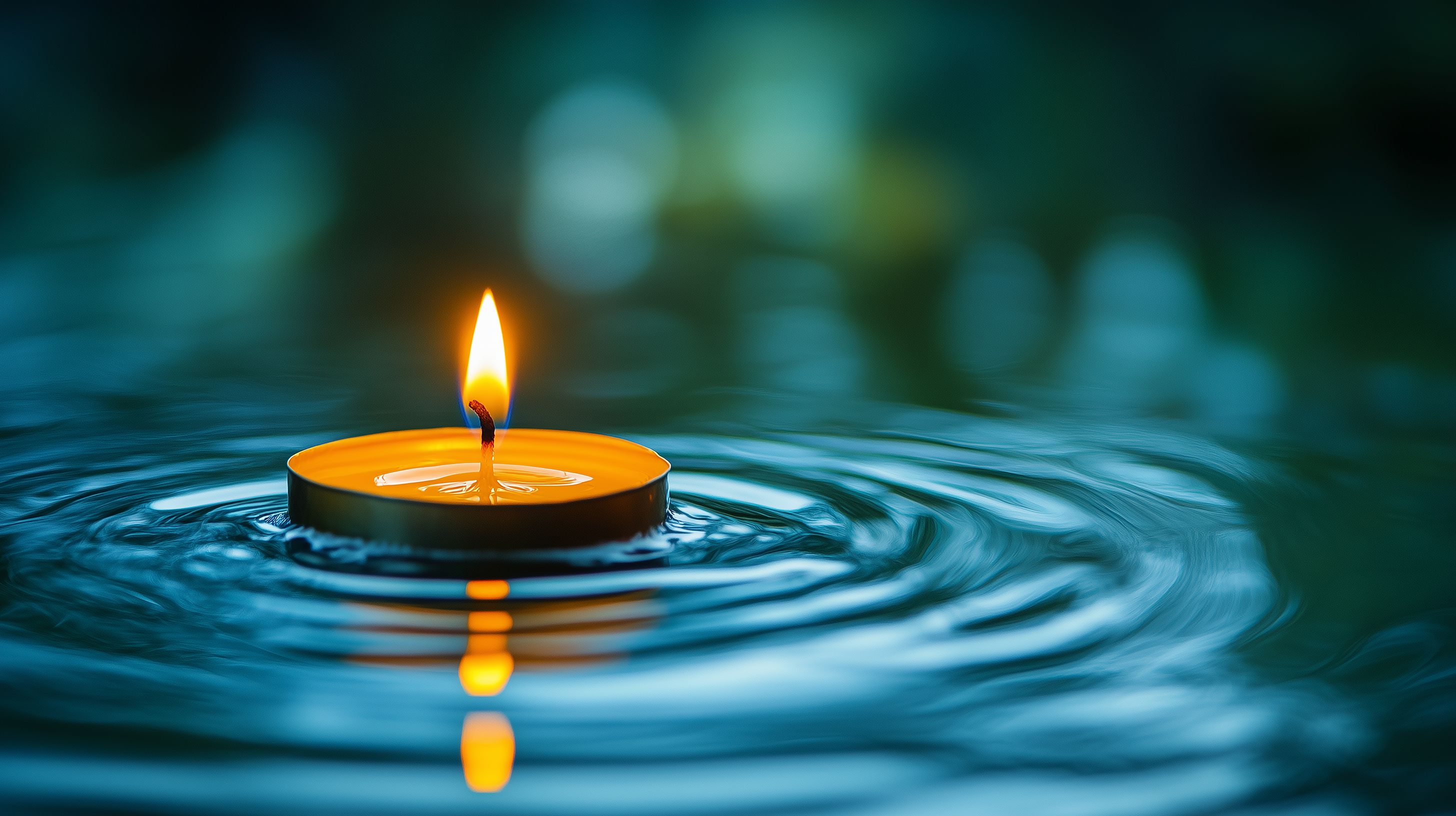 Dieses friedliche Hintergrundbild zeigt eine brennende Kerze, die auf ruhigem Wasser schwimmt. Die Kerze spiegelt sich malerisch in den wellenförmigen Bewegungen der Wasseroberfläche wider, die in einem tiefen Blaugrün gehalten sind. Die warme Beleuchtung der Flamme kontrastiert stimmungsvoll mit den kühlen Farbtönen des Wassers und der unscharfen Umgebung. Dieses kostenlose Stockfoto in hoher Auflösung eignet sich ideal für Blogs, Newsletter, Social-Media-Posts oder Werbeanzeigen, die eine ruhige, entspannte Atmosphäre vermitteln möchten. Es steht unter der Creative-Commons-Lizenz zur Verwendung bereit.