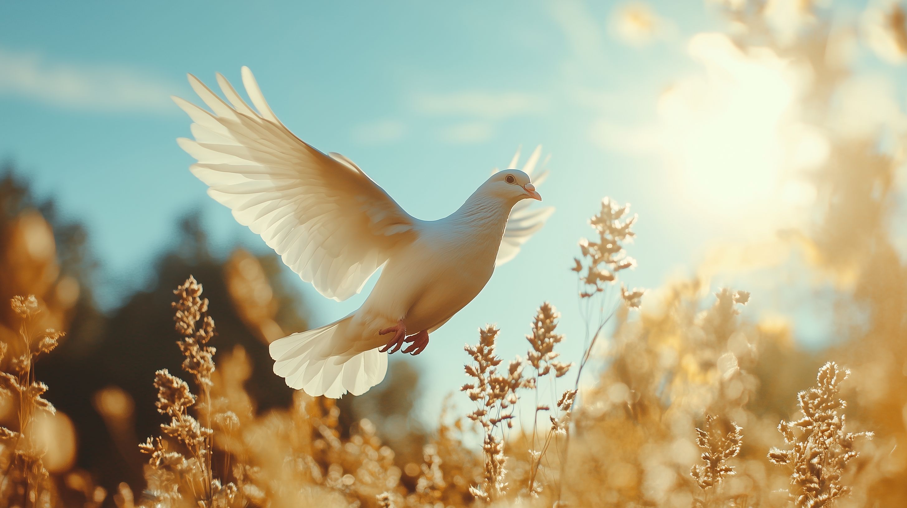 Dieses wunderschöne Foto zeigt eine friedliche weiße Taube, die in einer goldenen, sonnenerleuchteten Landschaft fliegt. Die Taube hebt sich vor dem blauen Himmel ab und lässt ihre eleganten Flügel schwingen. Die herbstlichen Gräser und Blumen im Vordergrund verleihen der Szene eine warme, stimmungsvolle Atmosphäre. Dieses kostenlose Stockfoto in hoher Auflösung eignet sich perfekt für den Einsatz in Blogs, Newslettern, Social-Media-Beiträgen oder Werbematerialien unter der Creative-Commons-Lizenz.