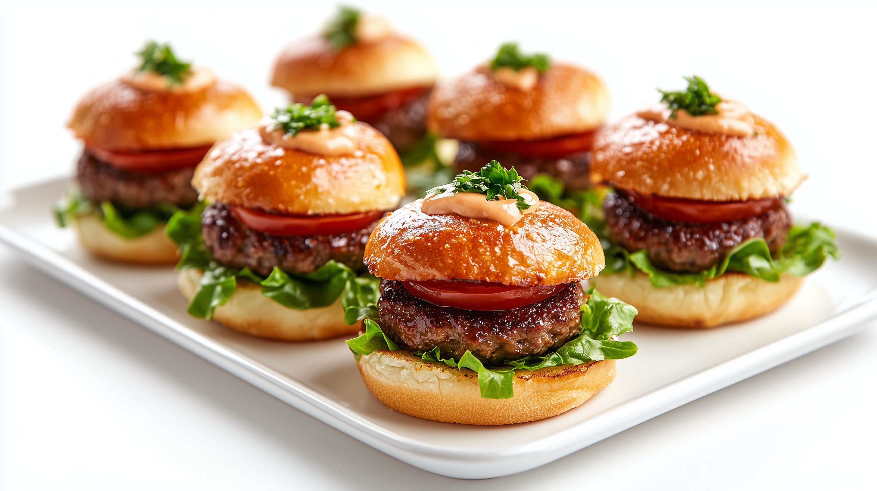 Das Bild zeigt eine Reihe köstlicher Miniburger, die auf einem weißen Teller angerichtet sind. Die Burger sind mit saftigem Fleisch, knackigem Salat, reifen Tomaten und einer leckeren Sauce belegt, die auf den goldbraunen Brötchen platziert sind. Die Anordnung der Burger ist sehr appetitlich und einladend, wobei die Farben des Grüns, Rots und Brauns einen schönen Kontrast bilden. Dieses Foto eignet sich hervorragend als kostenloses Stockfoto für verschiedene Einsatzbereiche wie Blogs, Soziale Medien oder Werbung im Gastronomie- und Lebensmittelbereich. Es ist in hoher Auflösung und unter einer Creative-Commons-Lizenz verfügbar.