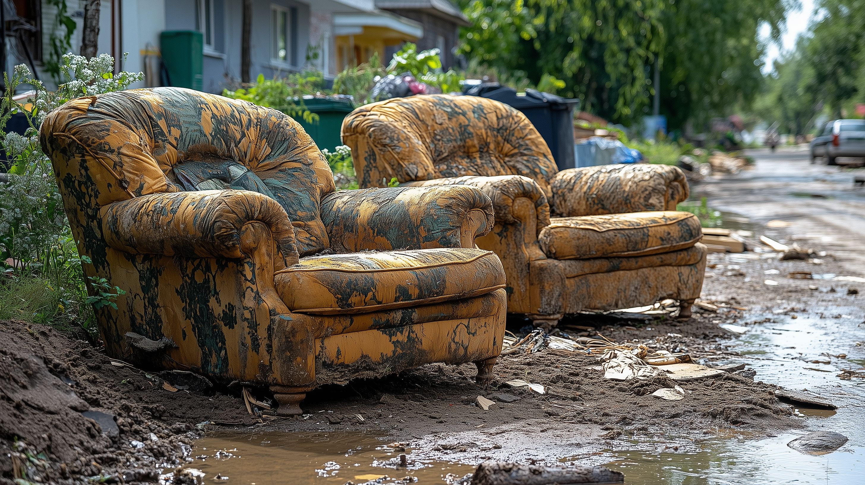 Das Bild zeigt eine verwüstete Straße nach einem Hochwasserereignis. Im Vordergrund liegen mehrere zerstörte und durchnässte Polstermöbel, die von Schlamm und Schmutz überzogen sind. Im Hintergrund sind Bäume und Sträucher zu sehen, was einen natürlichen Kontrast zur Zerstörung bildet. Das Foto vermittelt den Eindruck einer Katastrophe und der Auswirkungen von Naturgewalten. Es eignet sich gut als kostenloses Stockfoto für Beiträge zu Themen wie Umweltschutz, Katastrophenmanagement oder Berichterstattung über Extremwetterereignisse. Die hohe Auflösung und Creative-Commons-Lizenz ermöglichen eine flexible Nutzung in verschiedenen Medien wie Blogs, Websites oder Werbekampagnen.