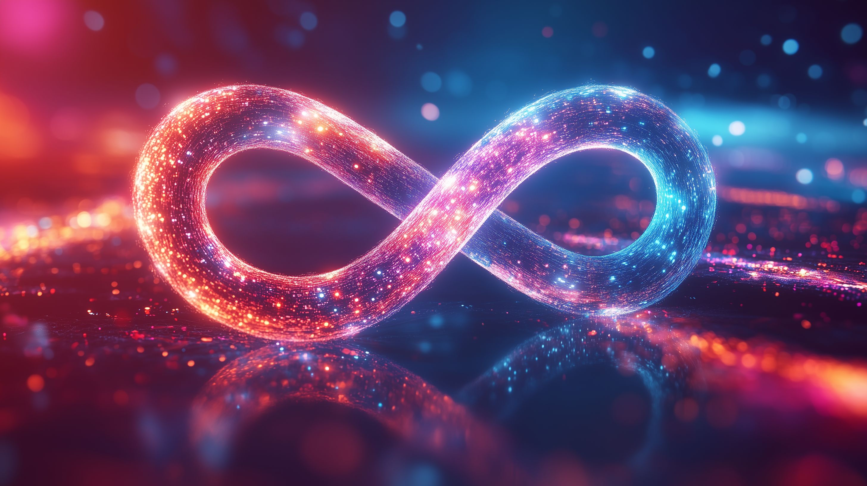 Dieses beeindruckende Bild zeigt ein leuchtendes Unendlichkeitssymbol, das in bunten Neonfarben vor einem futuristischen Hintergrund schwebt. Die geschwungene Form ist von funkelnden Lichteffekten umgeben, die eine dynamische und faszinierende Wirkung erzeugen. Die Kombination aus kräftigen Rot-, Orange- und Blautönen verleiht dem Motiv einen modernen, digitalisierten Charakter.