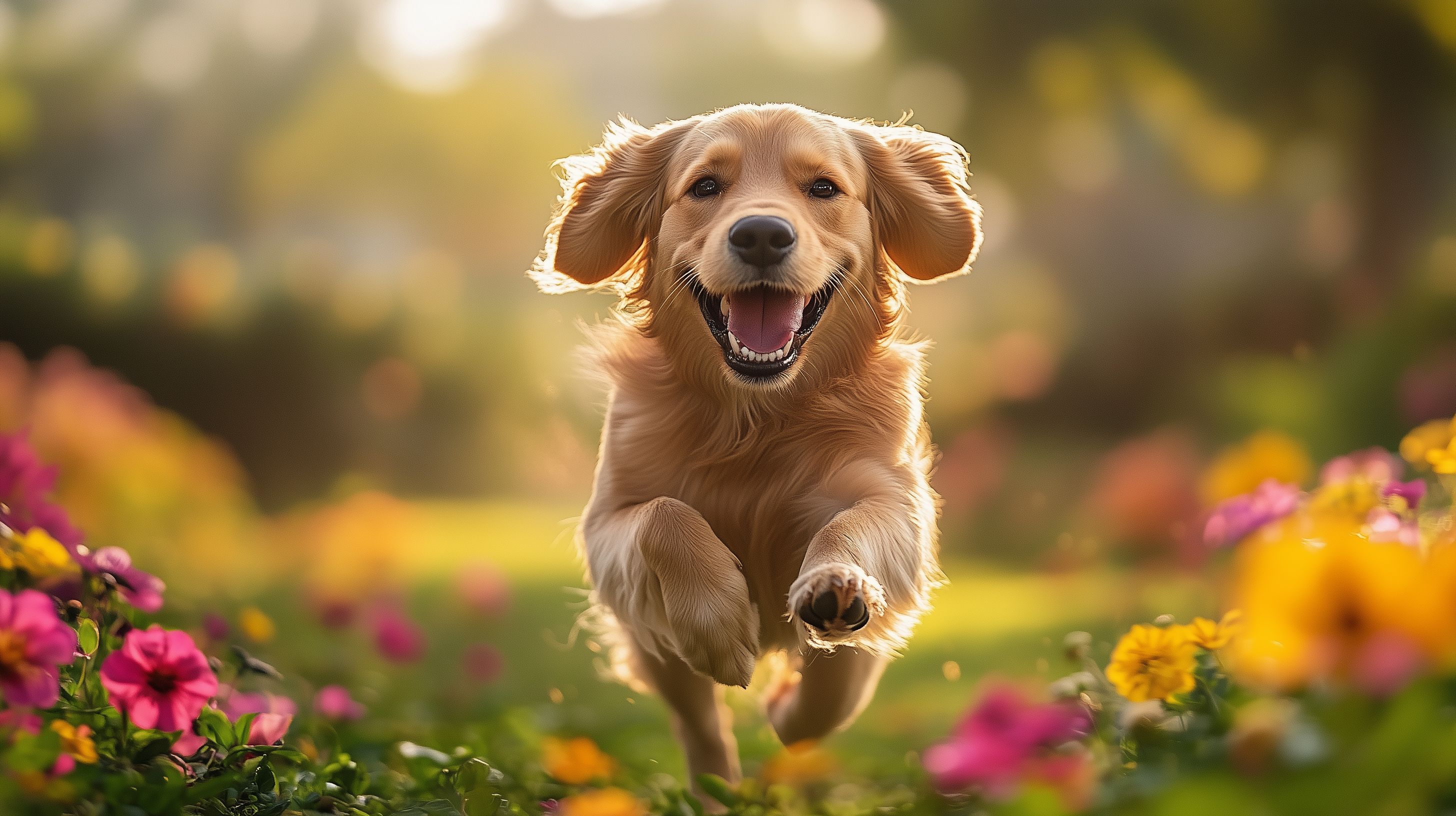 Das Bild zeigt einen glücklichen Golden Retriever, der fröhlich durch einen blumigen Garten läuft. Der Hund hat ein einladendes Lächeln auf dem Gesicht und scheint die Freiheit und Lebensfreude in vollen Zügen zu genießen. Im Hintergrund sind bunte Blumen und eine sommerliche, natürliche Umgebung zu sehen, die dem Bild eine idyllische und entspannende Atmosphäre verleihen. Dieses kostenlose Stockfoto in hoher Auflösung unter Creative-Commons-Lizenz eignet sich hervorragend für Blogs, Newsletter, Social-Media-Beiträge oder Werbematerialien, die eine positive und natürliche Stimmung vermitteln möchten.