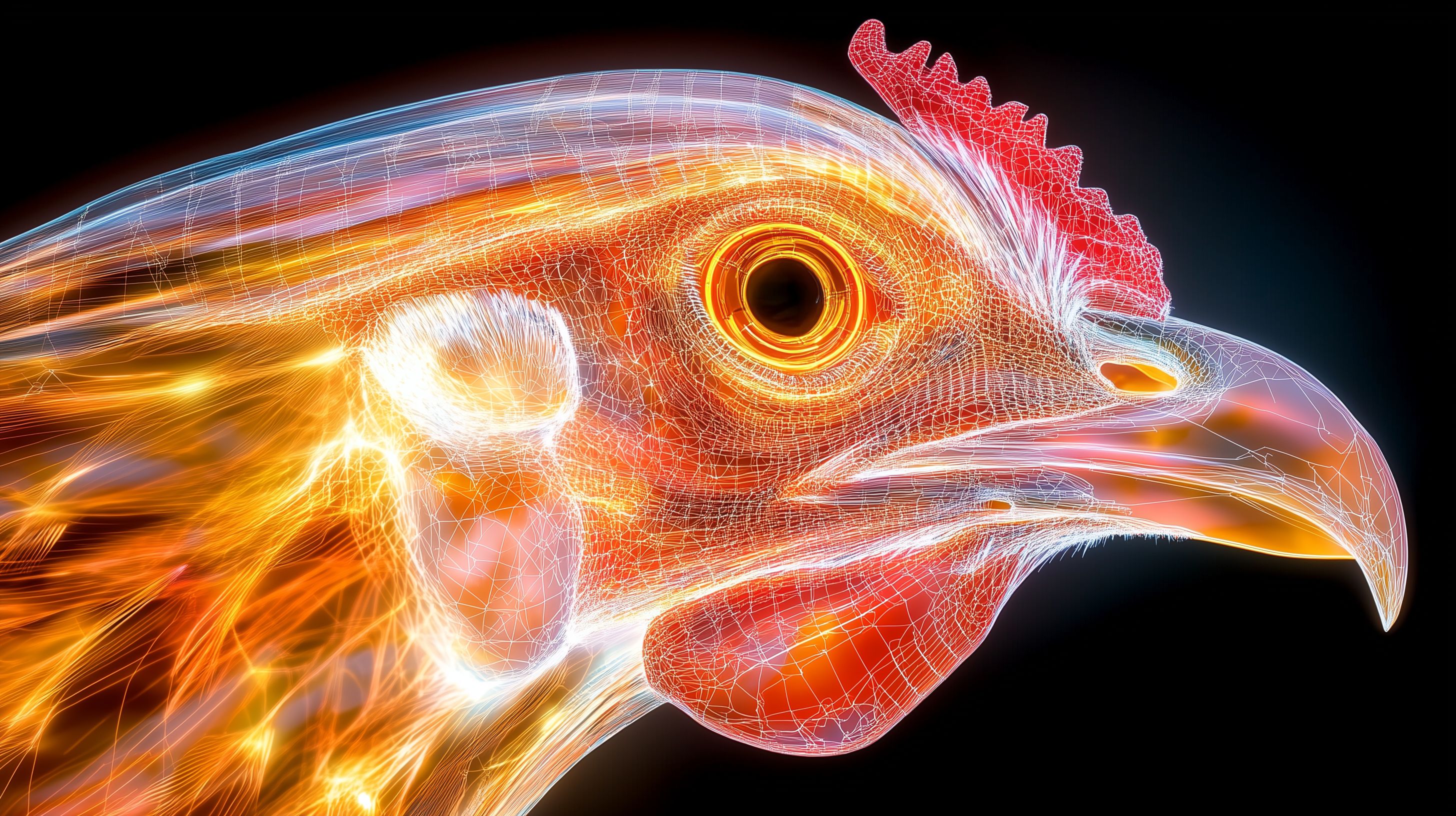 Dieses faszinierende digitale Bild zeigt einen futuristischen Hahnen-Kopf mit einer Drahtgitter-Struktur in leuchtendem Neon-Farbspiel. Der Blick des Hahns ist klar und durchdringend, die Federn sind in einem Wechselspiel aus warmen und kalten Tönen dargestellt. Die ausgefeilte Komposition und das hochtechnologische Design verleihen dem Motiv einen einzigartigen, modernen Charakter. Dieses Stockfoto eignet sich hervorragend für den Einsatz in Blog-Beiträgen, Newslettern, Social-Media-Kampagnen oder kreativen Werbematerialien. Das hochauflösende Bild steht unter der Creative-Commons-Lizenz zur freien Nutzung zur Verfügung.