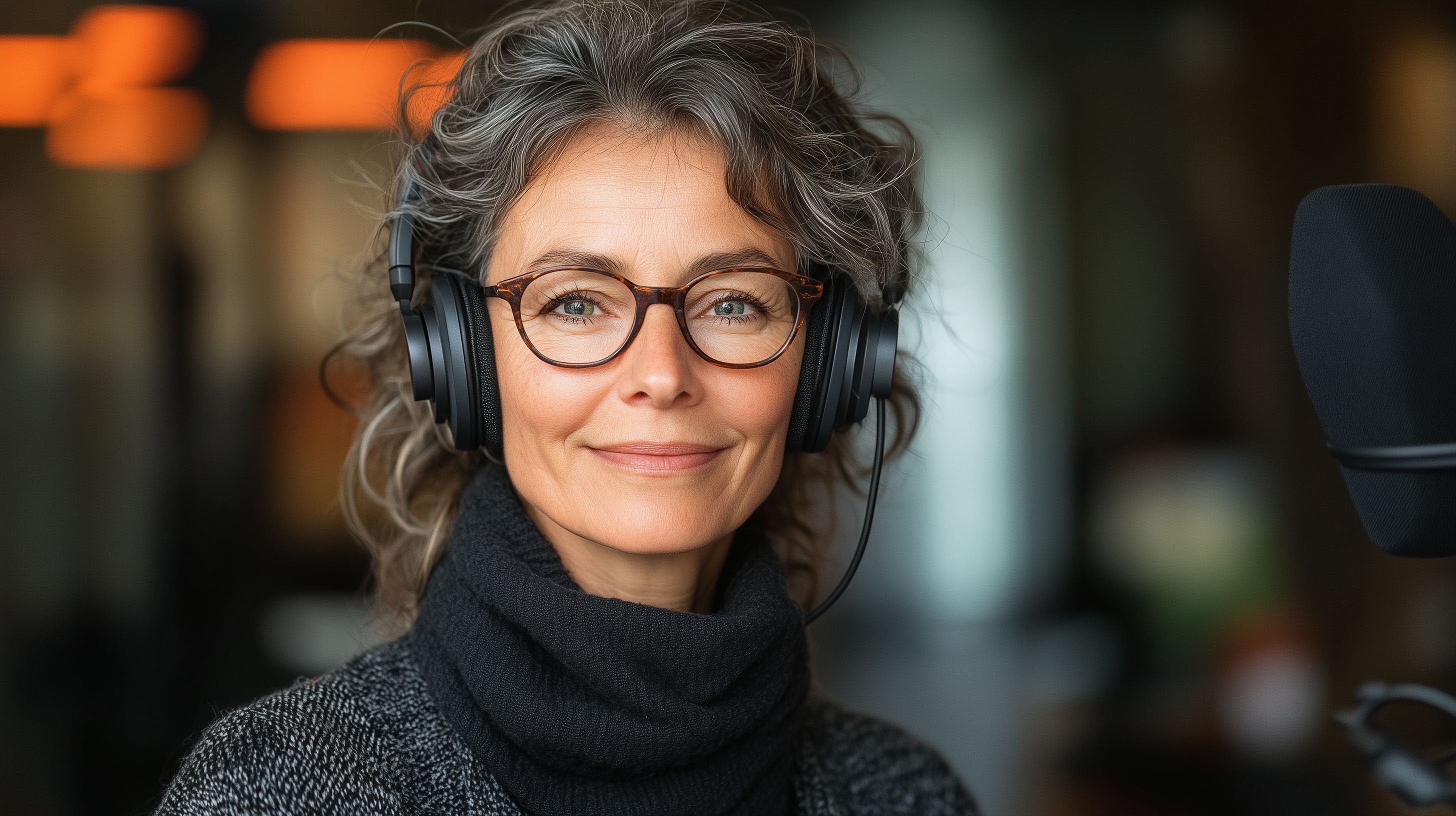Dieses Stockfoto zeigt eine ältere Frau, die in einem professionellen Aufnahme-Studio sitzt und Kopfhörer trägt. Sie hat graue, lockige Haare und eine Brille, die ihren konzentrierten Gesichtsausdruck unterstreichen. Im Hintergrund ist ein mikrofonförmiges Aufnahmegerät zu sehen, was vermuten lässt, dass die Frau einen Podcast oder ein anderes Audio-Format aufnimmt. Das Bild strahlt Produktivität, Kreativität und Fokus aus und kann perfekt für Werbung, Newsletter, Social-Media-Beiträge oder Blogeinträge zum Thema Podcasting, Audio-Produktion oder digitale Medien eingesetzt werden. Dieses hochauflösende Stockfoto steht unter einer Creative-Commons-Lizenz zur Verfügung.