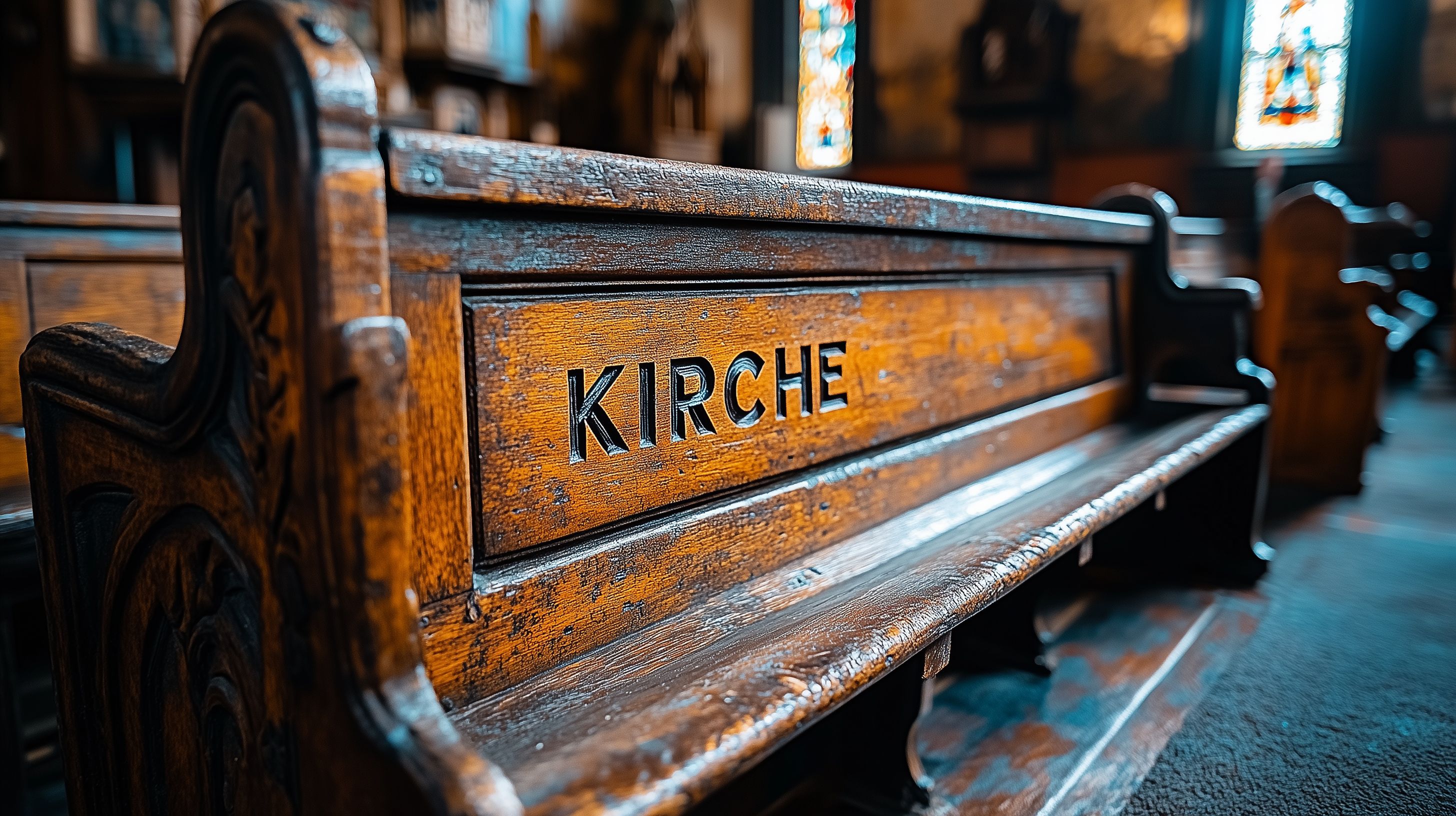 Dieses Foto zeigt eine detailreiche Kirchenbank mit einer mystischen Gravur in einem dunklen, stimmungsvollen Kirchenraum. Der Blick fällt auf die prägnante Beschriftung 'KIRCHE' auf dem massiven Holzmöbel, das von einem warmen Lichtschein umgeben ist. Im Hintergrund sind weitere Kirchenbänke sowie Buntglasfenster und Gemälde an den Wänden zu erkennen, die eine sakrale Atmosphäre schaffen. Das Foto vermittelt eine Stimmung von Andacht, Spiritualität und Authentizität. Als hochwertiges, kostenloses Stockfoto in hoher Auflösung und unter Creative-Commons-Lizenz eignet es sich ideal für Blog-Beiträge, Newsletter, Social-Media-Posts oder Werbeanzeigen mit religiösem, stimmungsvollem oder vintage-inspiriertem Charakter.