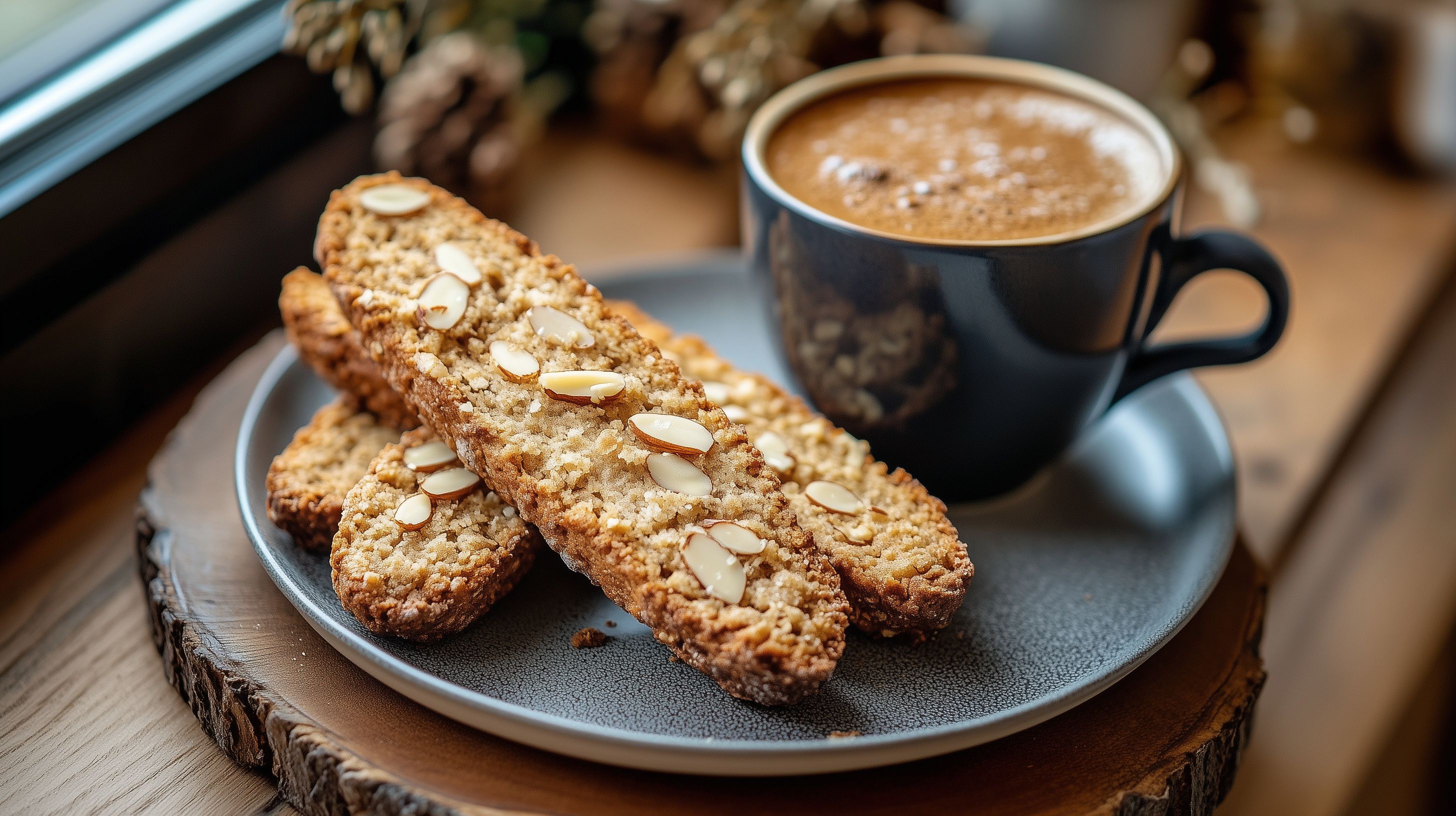 Das Bild zeigt eine einladende Komposition aus knusprigen Mandelbiscotti und einem dampfenden Cappuccino auf einem rustikalen Holztisch. Die warmen Erdtöne und die natürlichen Materialien schaffen eine gemütliche, herbstliche Atmosphäre. Die Biscotti sind mit gerösteten Mandeln bestreut und sehen verführerisch lecker aus. Der Cappuccino verspricht einen cremigen Genuss, der perfekt zu den knusprigen Keksen passt. Dieses Foto eignet sich hervorragend für Beiträge zu Kaffee, Backwaren, Frühstücksideen oder herbstliche Stimmungsbilder. Es ist ein kostenloses Stockfoto in hoher Auflösung, das unter Creative Commons-Lizenz steht und flexibel in Blogs, Newslettern oder Social-Media-Kanälen eingesetzt werden kann.