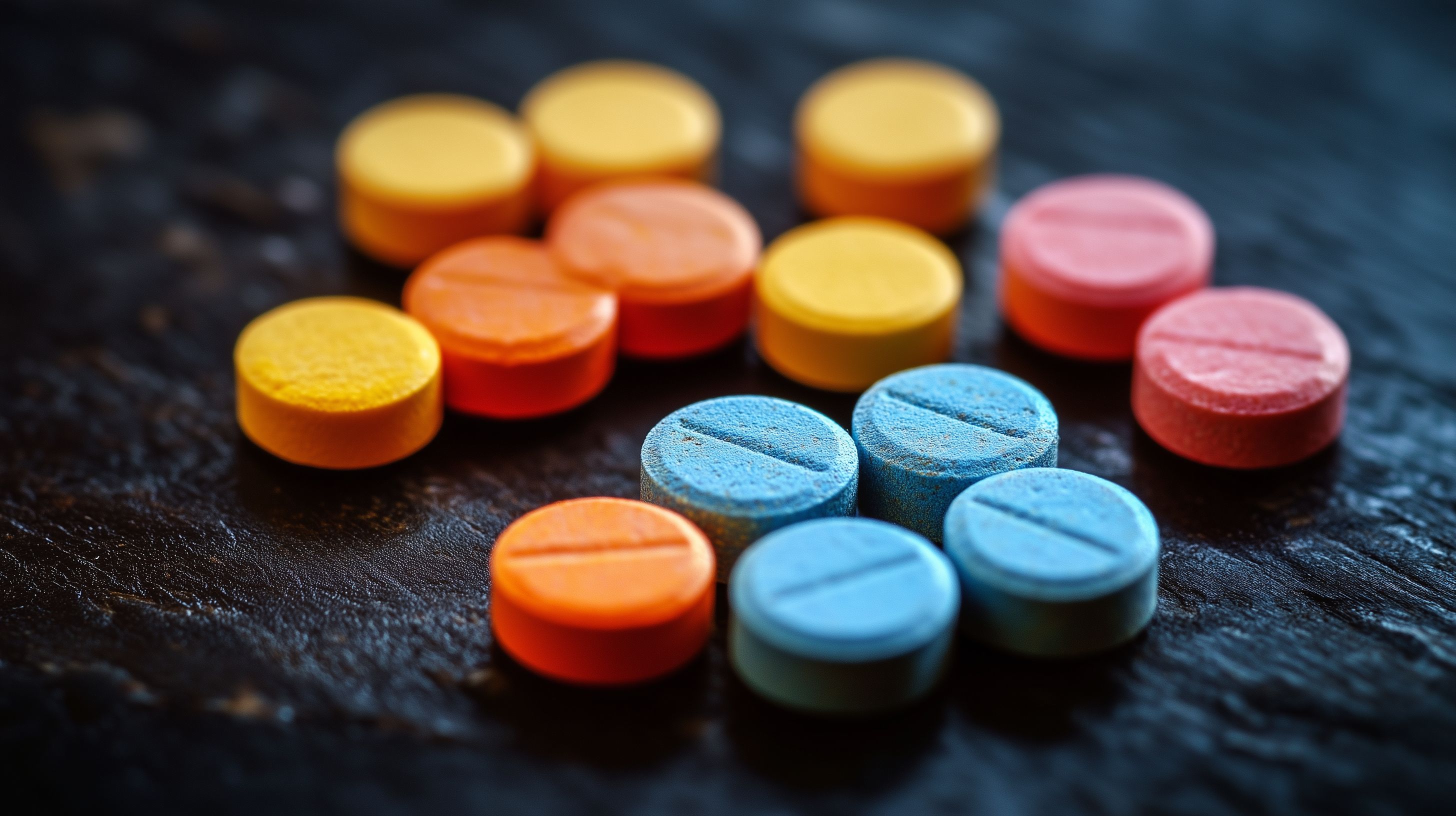 Dieses Bild zeigt eine Nahaufnahme verschiedener bunter Medikamentenformulierungen auf einem dunklen, hölzernen Hintergrund. Die Tabletten und Kapseln sind in verschiedenen Formen und Farben wie Orange, Gelb, Blau und Rot angeordnet. Die Aufnahme hat einen monochromatischen, dunklen Farbstil, was dem Motiv eine mystische und intensive Stimmung verleiht.