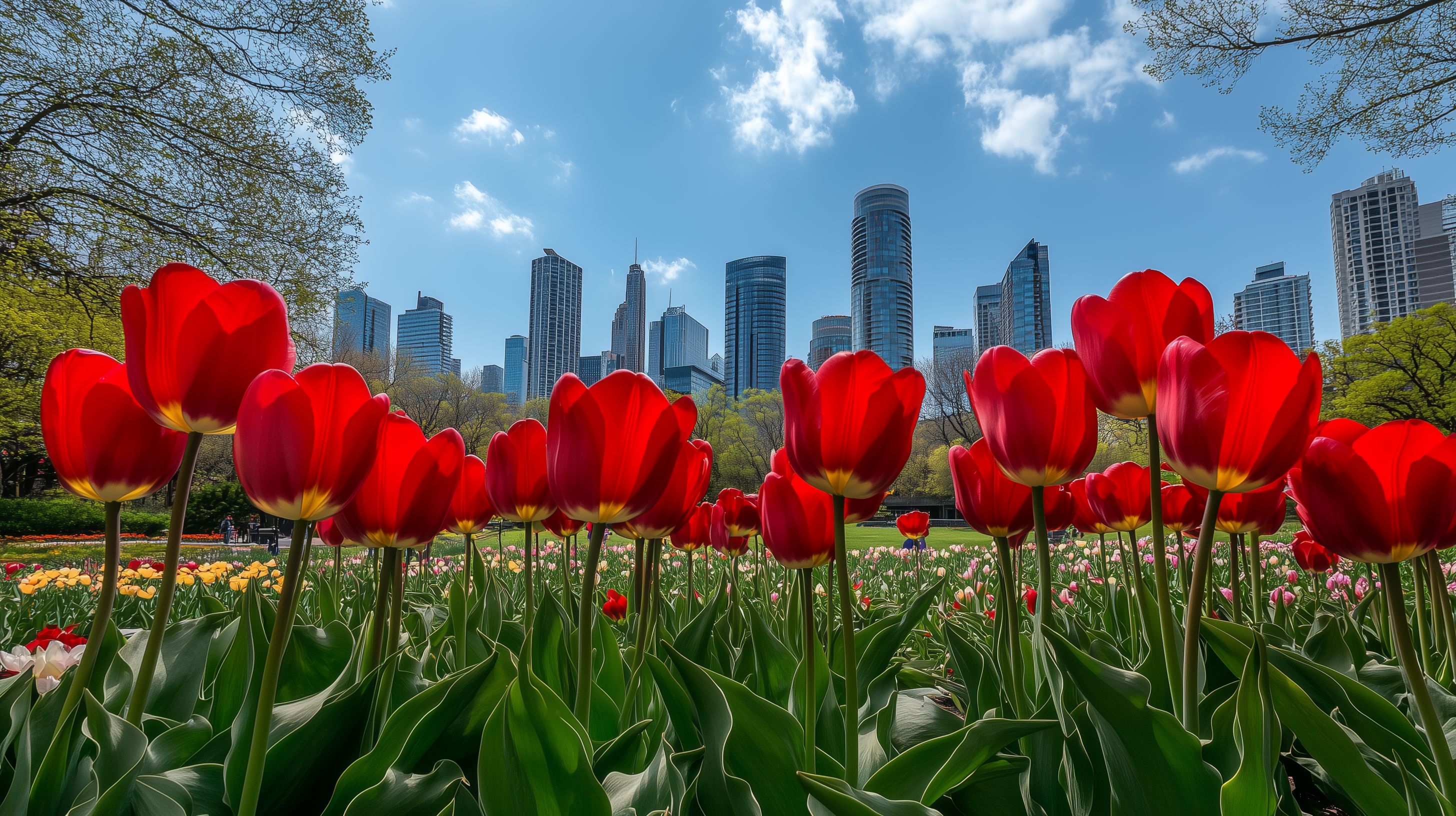 Dieses Foto zeigt eine atemberaubende Szene von leuchtend roten Tulpenblüten in einer modernen Stadtkulisse. Die Tulpen erstrecken sich über eine große Fläche in einem Stadtpark, umrahmt von hohen Wolkenkratzern im Hintergrund. Das Zusammenspiel von der Blütenpracht der Tulpen und den markanten Gebäuden schafft einen faszinierenden Kontrast zwischen Natur und Urbanität. Die Tulpen dominieren klar das Bild, ihre prägnanten Farben und Formen lenken den Blick des Betrachters auf sich. Dieses Foto wäre ideal einsetzbar für Magazin-Cover, Werbekampagnen, Reiseprospekte oder als auffälliges Element in Blogbeiträgen und Newsletter. Als hochauflösendes, kostenloses Stockfoto unter einer Creative-Commons-Lizenz kann es für vielfältige Zwecke genutzt werden.