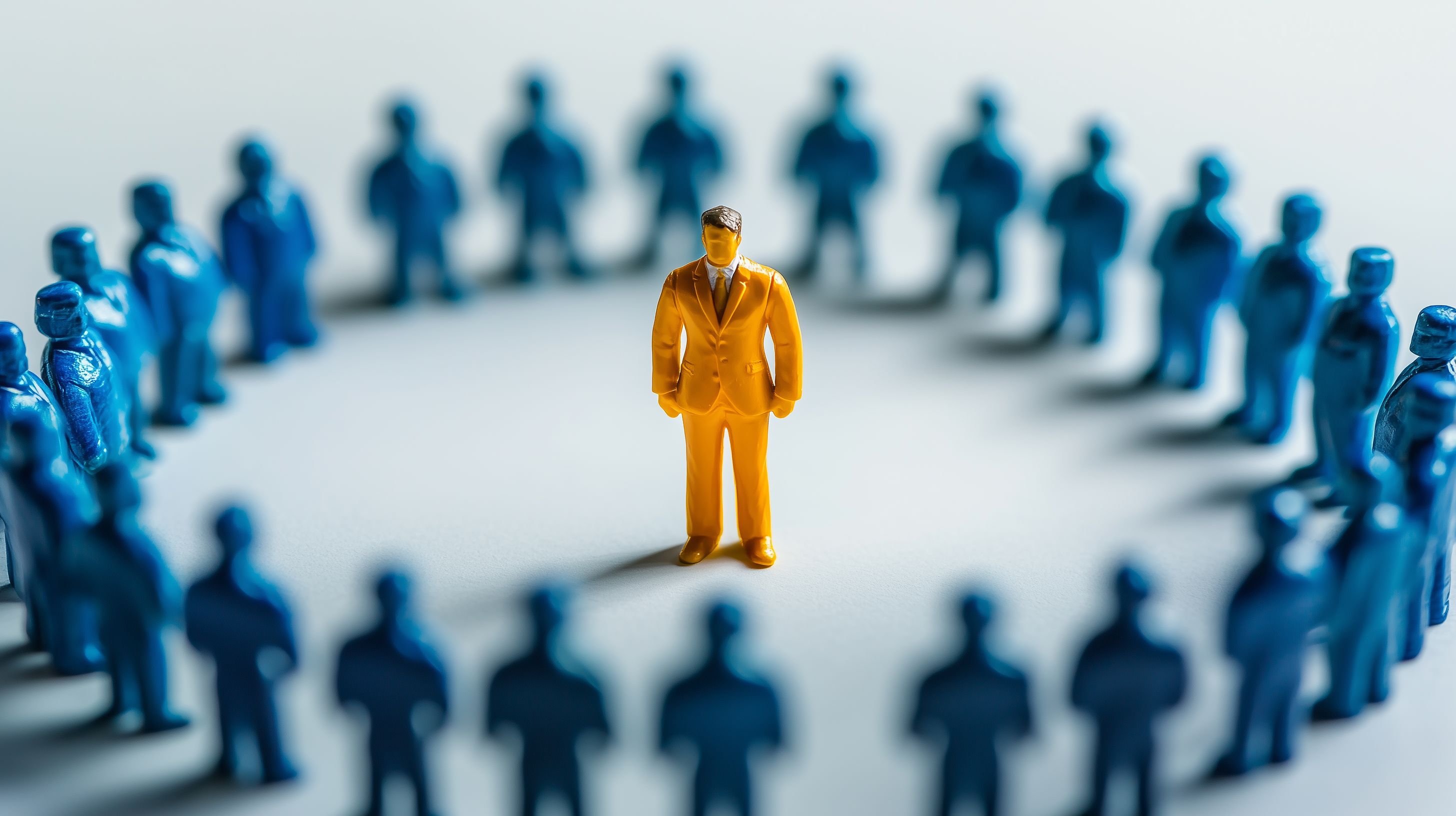Das Bild zeigt eine symbolische Darstellung von Führung und Macht. Eine einzelne gelbe Figurine steht im Mittelpunkt eines Kreises aus vielen blauen Figurinen. Die blauen Figuren repräsentieren die Masse, während die gelbe Figur die Führungskraft oder den Entscheidungsträger verkörpert. Das Bild vermittelt visuelle Metaphern für Konzepte wie Individualität, Konformität, Teamwork und Hierarchie. Es eignet sich gut für Blogs, Newsletter, Social-Media-Posts und Werbematerialien zu Themen wie Unternehmensführung, Personalmanagement oder organisatorische Veränderung. Dieses hochauflösende, kostenlose Stockfoto unter Creative-Commons-Lizenz kann vielfältig in digitalen Medien eingesetzt werden.