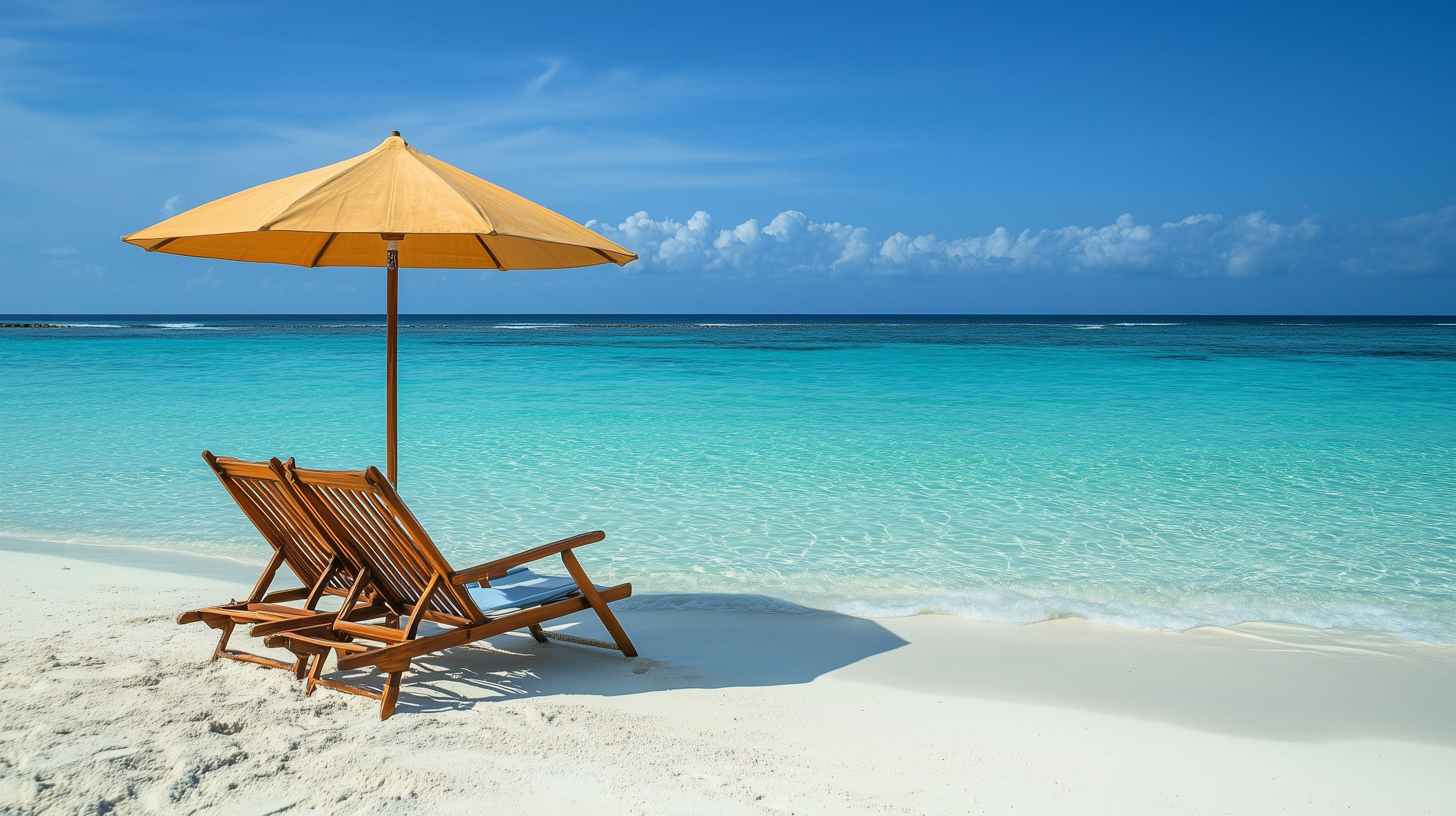 Dieses Bild zeigt eine idyllische Strandszene mit türkisfarbenem Meer, weißem Sand und bequemen Holzliegen unter einem gelben Sonnenschirm. Die Perspektive gibt dem Betrachter das Gefühl, selbst an diesem tropischen Traumstrand zu entspannen und die Seele baumeln zu lassen. Das Foto eignet sich perfekt als Hintergrundbild für Blogs, Newsletter, Social-Media-Kanäle oder Werbemotive rund um das Thema Urlaub, Reisen und Entspannung. Dieses hochauflösende Stockfoto steht unter der Creative-Commons-Lizenz und kann kostenlos genutzt werden.