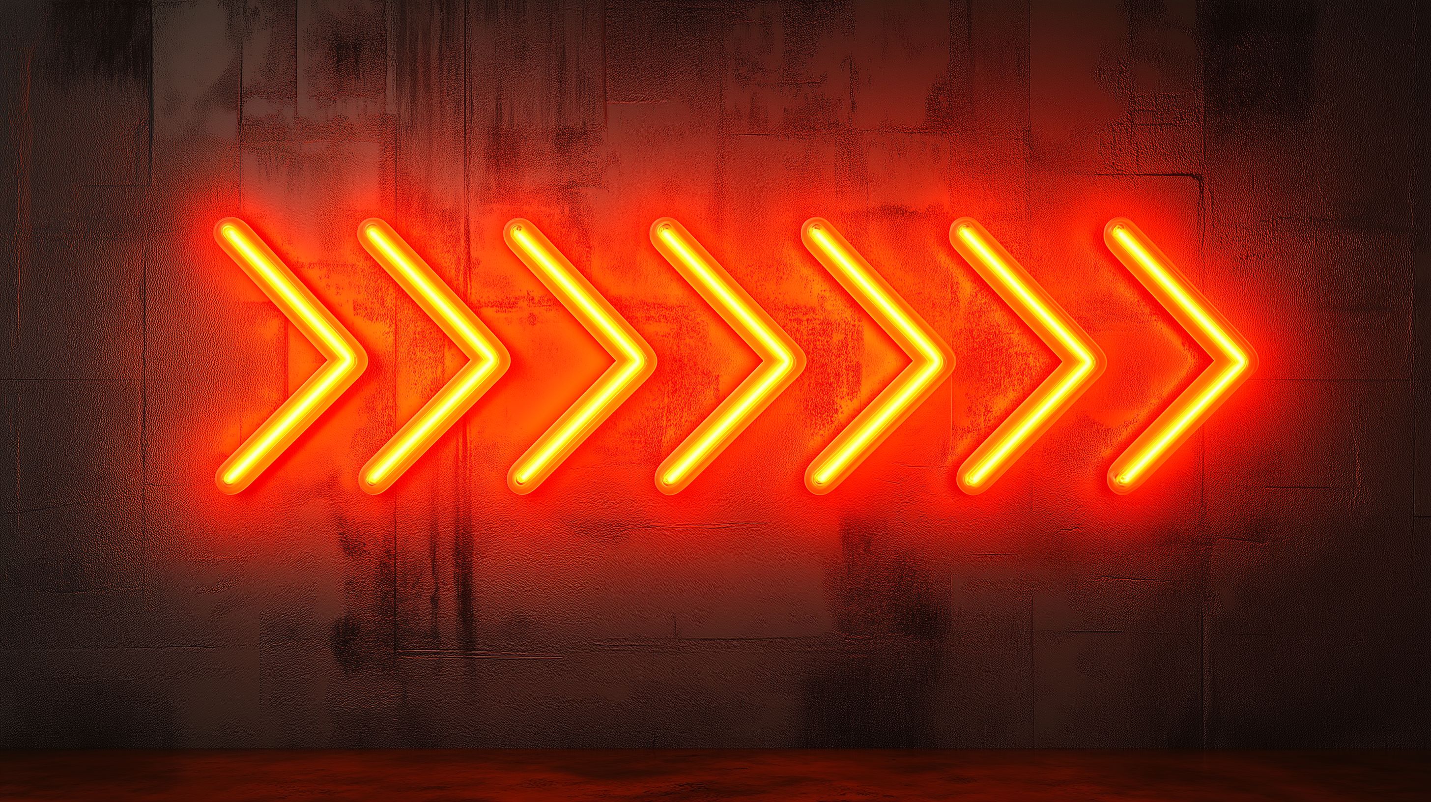 Das Bild zeigt eine Reihe von leuchtenden Neonpfeilen in intensivem Orange, die in einer geraden Linie auf einer dunklen Wand angeordnet sind. Die Pfeile haben eine geometrische, minimalistische Form und erinnern an einen modernen, industriellen Wegweiser. Die Farbgebung und der Retro-Stil verleihen dem Bild einen besonderen Charakter und machen es zu einem interessanten Element für die Gestaltung von Blogs, Newslettern, sozialen Medien oder Werbematerialien. Dieses hochauflösende, kostenlose Stockfoto unter Creative-Commons-Lizenz eignet sich hervorragend für verschiedenste digitale Projekte.