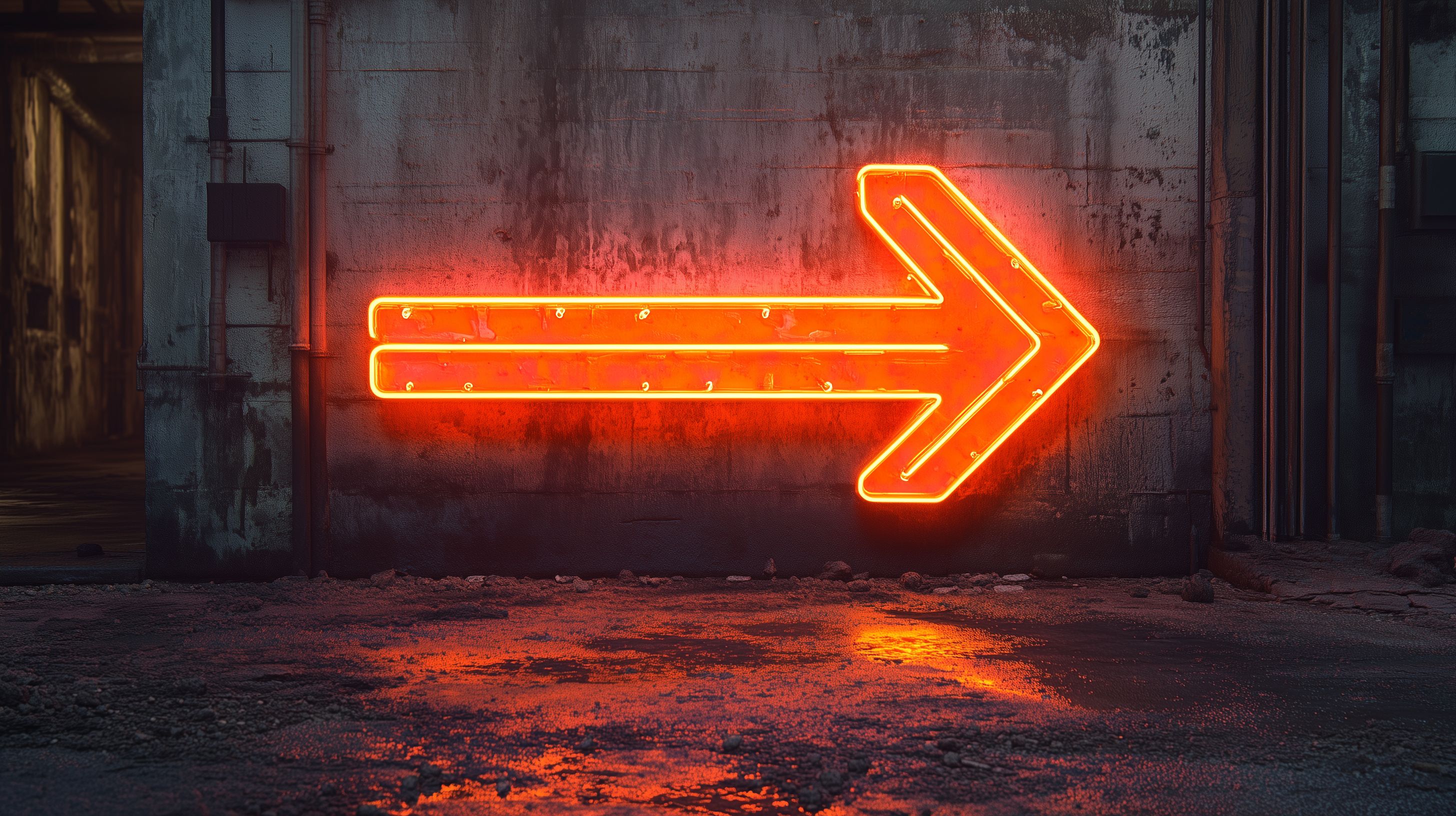 Das Foto zeigt einen leuchtenden Neonpfeil, der in einer verlassenen, heruntergekommenen Industriehalle angebracht ist. Das rötlich-orange Licht des Pfeils strahlt in der Dunkelheit und verleiht der Szene eine mystische, spannungsgeladene Atmosphäre. Die Grunge-Optik der Wand und der bröckelnde Boden unterstreichen den düsteren, urbanen Charakter des Bildmotivs. Dieses Foto eignet sich hervorragend für den Einsatz in Blogs, Newslettern oder Social-Media-Beiträgen, die ein modernes, auffälliges und kreatives Erscheinungsbild vermitteln wollen. Als hochauflösendes, kostenloses Stockfoto unter Creative-Commons-Lizenz ist es vielseitig nutzbar.