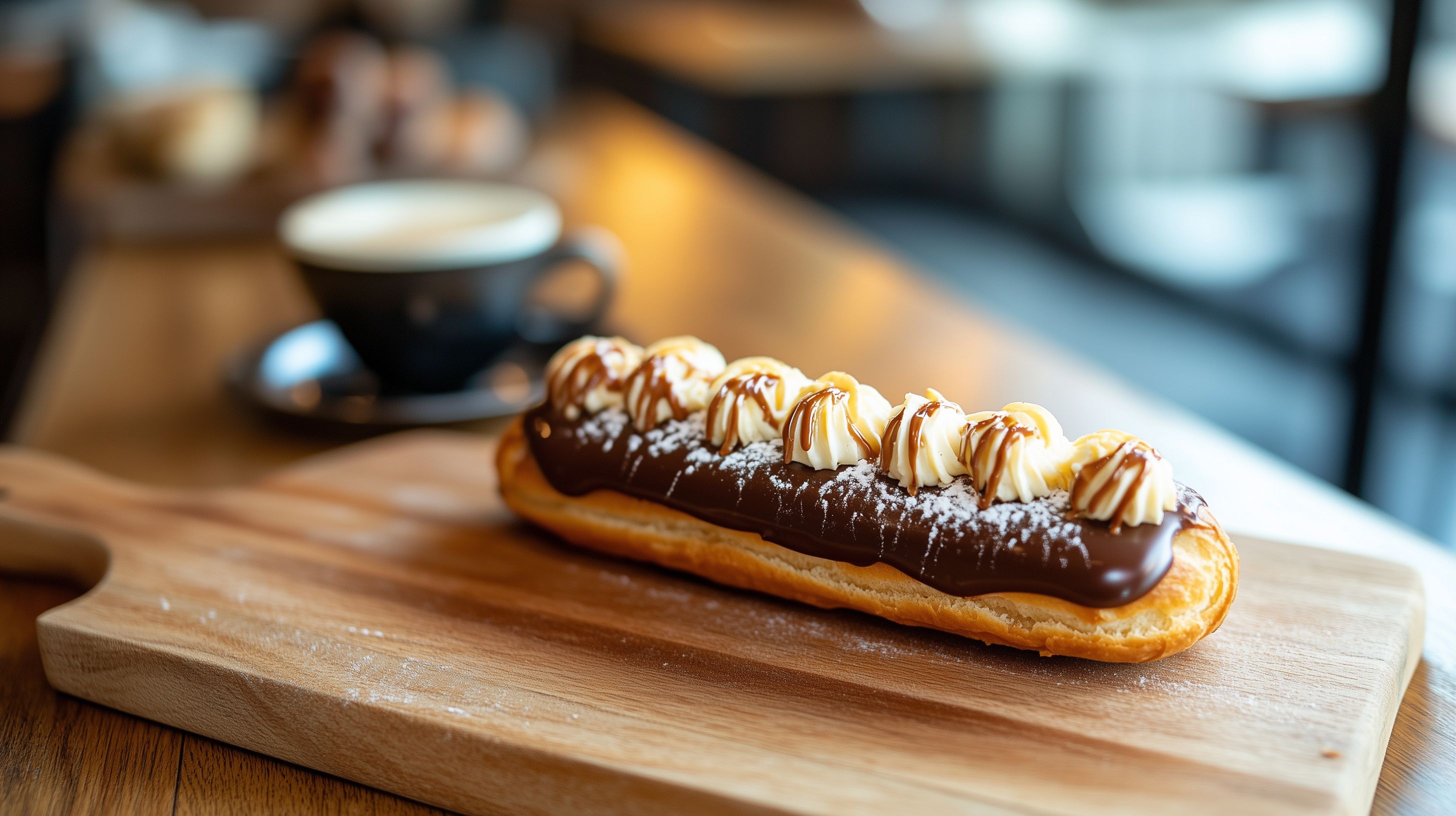Das Bild zeigt einen frisch gebackenen Schokoladen-Eclaire, der auf einem rustikalen Holzbrett präsentiert wird. Neben dem Eclaire steht eine Tasse Kaffee, was eine gemütliche Café-Atmosphäre schafft. Die Schokoladenglasur glänzt verführerisch und die Sahnehaube verleiht dem Dessert eine elegante Optik. Dieses Foto eignet sich perfekt als Hingucker für Blogbeiträge, Newsletter oder Social-Media-Kanäle rund um das Thema Backwaren, Cafés und Genuss. Als hochwertiges, kostenloses Stockfoto unter Creative-Commons-Lizenz ist es vielseitig einsetzbar.