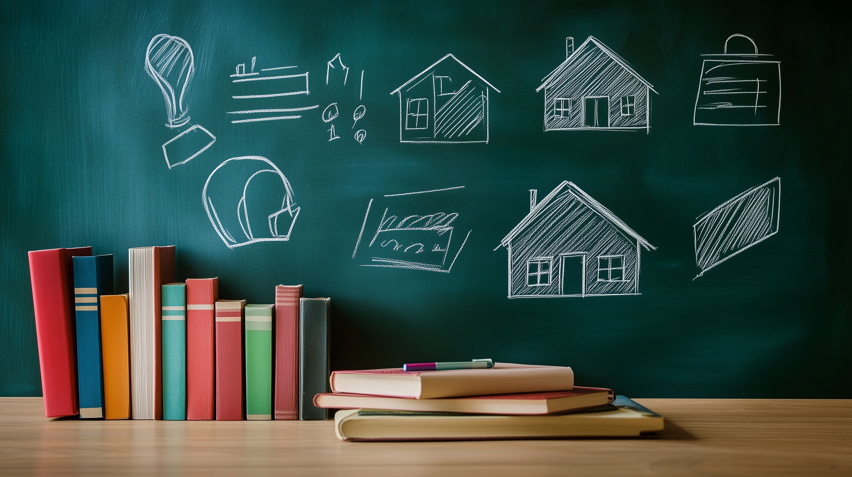Das Bild zeigt eine grüne Tafel, auf der verschiedene Kreidesymbole und -skizzen zu sehen sind. Dazu gehören Bücher, Häuser, ein Koffer und andere grafische Elemente, die auf Themen wie Bildung, Lernen und Immobilien hinweisen. Vor der Tafel steht ein Holztisch mit mehreren Büchern darauf. Die Anordnung und der minimalistische Stil verleihen dem Bild einen klaren, symbolischen Charakter.