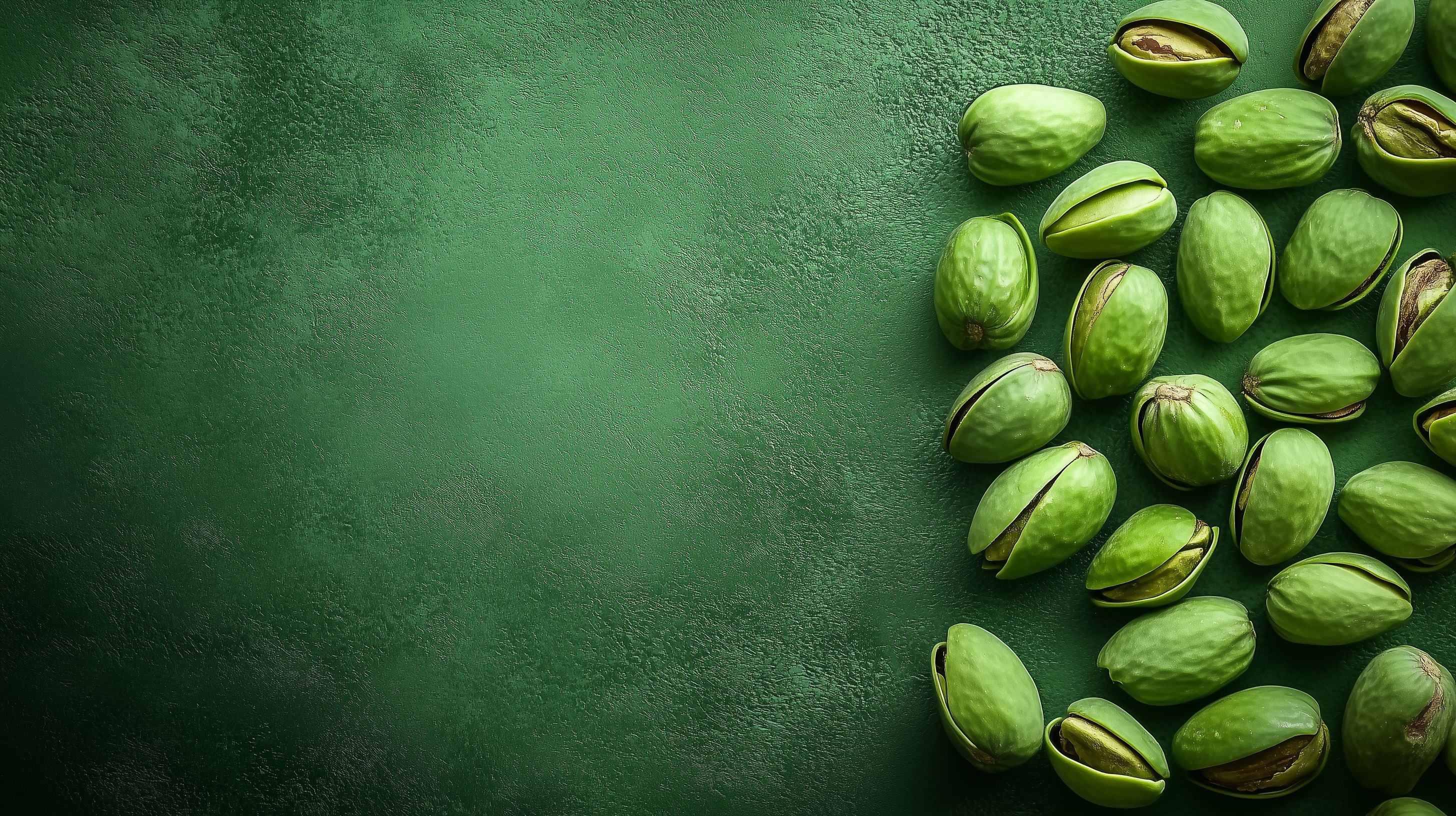 Das Bild zeigt eine Ansammlung von frischen, grünen Pistazien auf einem dunklen, grünen Hintergrund. Die Nüsse sind in verschiedenen Formen und Größen angeordnet, wodurch ein appetitliches und natürliches Arrangement entsteht. Der einfarbige Hintergrund lenkt die Aufmerksamkeit ganz auf die saftigen Pistazien und bietet viel Freiraum für Text oder weitere Gestaltungselemente.