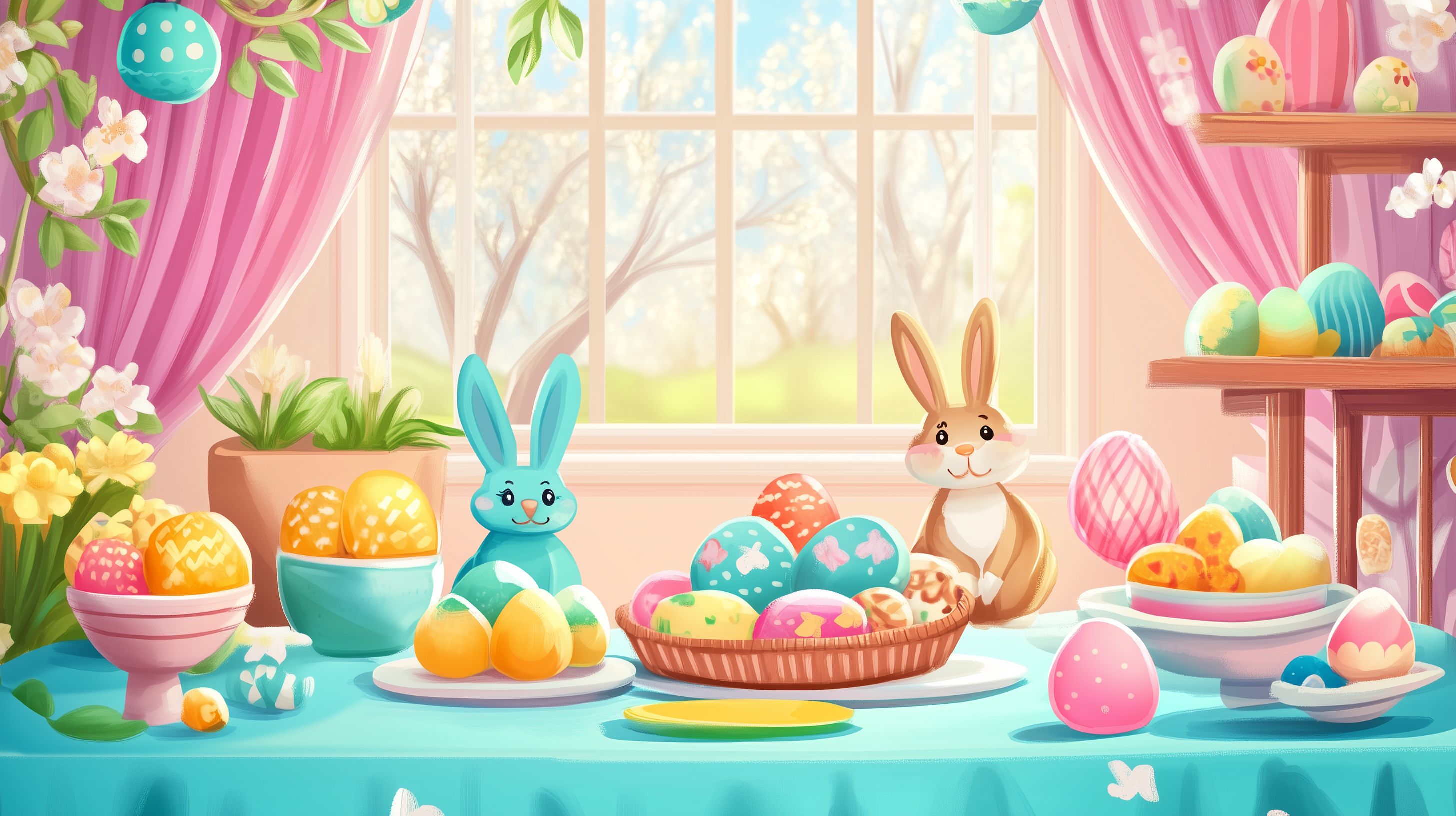 Dieses fröhliche Osterfoto zeigt eine detailreiche Frühlingsdekoraton mit Hasenstatuen, bemalten Eiern, Blumen und anderen süßen Akzenten. Der Fokus liegt auf einem reich gedeckten Tisch in pastelligen Farben vor einem Fenster mit rosa Vorhängen. Die Komposition ist harmonisch und einladend, ideal für Einsätze in Blogs, Newslettern, Social-Media-Kanälen oder Werbekampagnen rund um Ostern und den Frühling. Das hochauflösende Stockfoto ist unter einer Creative-Commons-Lizenz kostenfrei nutzbar.