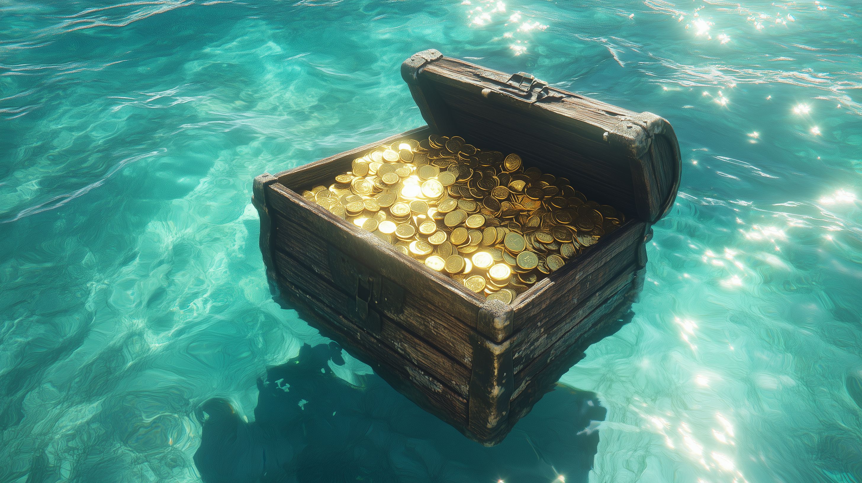Dieses atemberaubende Bild zeigt eine verlockende Schatztruhe voller Goldmünzen, die in den türkisfarbenen Tiefen eines kristallklaren Ozeans schwimmt. Die Perspektive lässt den Betrachter direkt an diesem Abenteuer teilhaben und die Kostbarkeiten entdecken. Die Komposition mit den funkelnden Reflexen auf der Wasseroberfläche erzeugt eine mystische und geheimnisvolle Atmosphäre. Dieses Stockfoto in hoher Auflösung lässt sich hervorragend für Blogbeiträge, Newsletter, Social-Media-Posts oder Werbematerialien zum Thema Reichtum, Schatzsuche oder Unterwasserwelt einsetzen und steht unter einer Creative-Commons-Lizenz zur Verfügung.