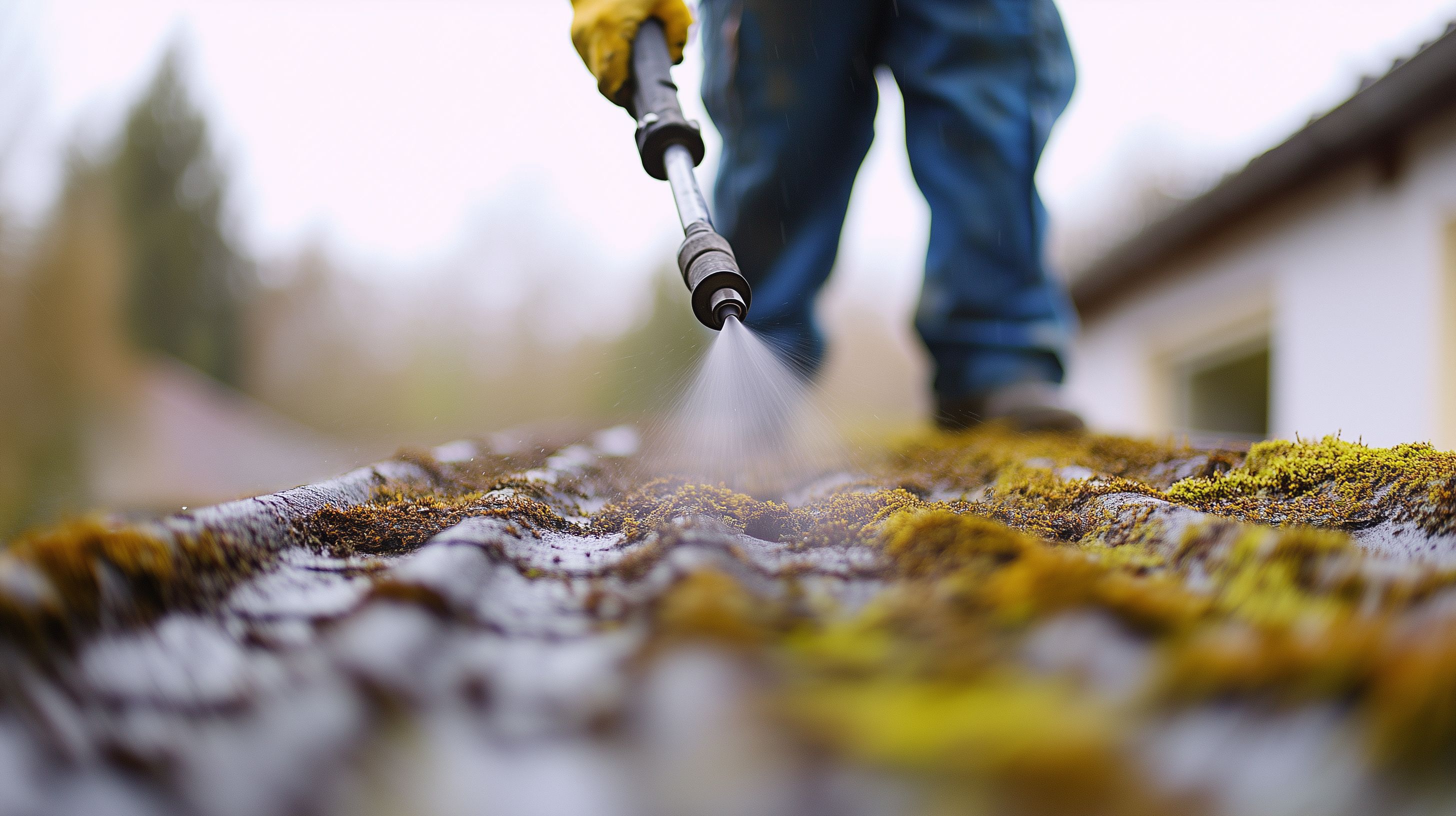 Dieses Bild zeigt einen Arbeiter, der mit einem Hochdruckreiniger Moos von einem Hausdach entfernt. Der Fokus liegt auf den Händen des Arbeiters, die den Hochdruckreiniger fest umklammern, während das Wasser mit hoher Kraft auf den moosbedeckten Dachboden spritzt. Die Nahaufnahme lässt die Textur und Struktur des Daches sowie die Feuchtigkeit und Spritzspuren des Wassers deutlich erkennen. Dieses Foto eignet sich hervorragend für die Verwendung in Blogs, Newslettern oder Social-Media-Beiträgen rund um Themen wie Dachpflege, Hausrenovierung oder Gartenarbeiten. Als kostenloses Stockfoto in hoher Auflösung und unter der Creative-Commons-Lizenz verfügbar, kann es frei genutzt werden.