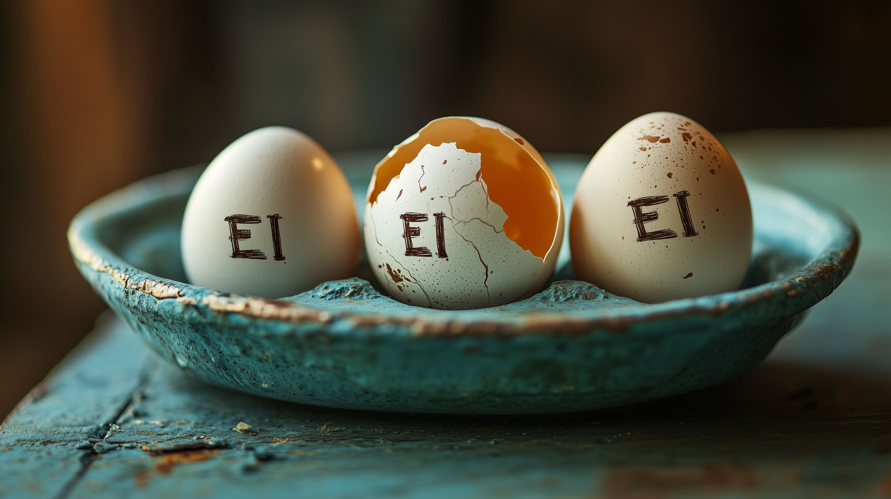 Das Bild zeigt drei Eier in einer rustikalen, türkisfarbenen Schale. Auf den Eiern sind die Buchstaben 'Ei' aufgedruckt. Eines der Eier ist leicht zerbrochen, was einen spannenden Kontrast zwischen dem intakten Design und dem Bruch erzeugt. Die Komposition, Beleuchtung und Farbgebung verleihen dem Foto einen stimmungsvollen, vintage-artigen Charakter. Dieses hochauflösende, kostenlose Stockfoto lässt sich hervorragend für Lebensmittel-Blogs, Social-Media-Beiträge, Newsletter-Designs oder Werbekampagnen rund um Frühstücksprodukte oder Eierspeisen einsetzen. Es steht unter der Creative-Commons-Lizenz zur Verfügung.