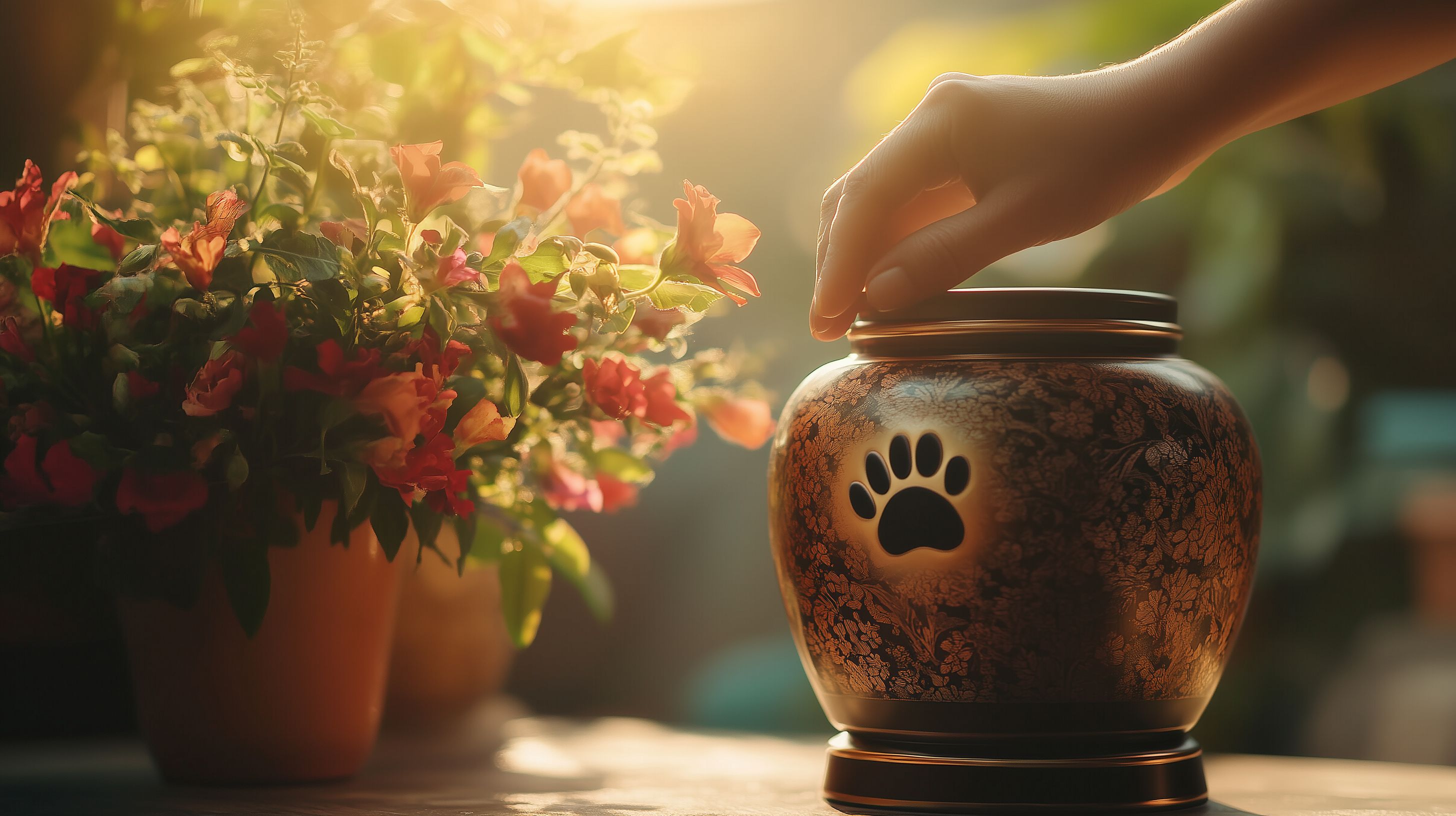 Das Bild zeigt eine Urne mit einem Pfotenabdruck, die in einer naturnahen Umgebung mit bunten Blüten und warmer Beleuchtung steht. Die Szene strahlt Ruhe, Würde und Erinnerung aus und eignet sich hervorragend als Stockfoto für Beiträge zum Thema Trauer, Abschied und Gedenken an geliebte Haustiere. Das hochwertige, kostenlose Foto in hoher Auflösung steht unter der Creative-Commons-Lizenz zur Verfügung und kann vielfältig in Blogs, Newslettern, Social-Media-Kanälen oder Werbematerialien eingesetzt werden.