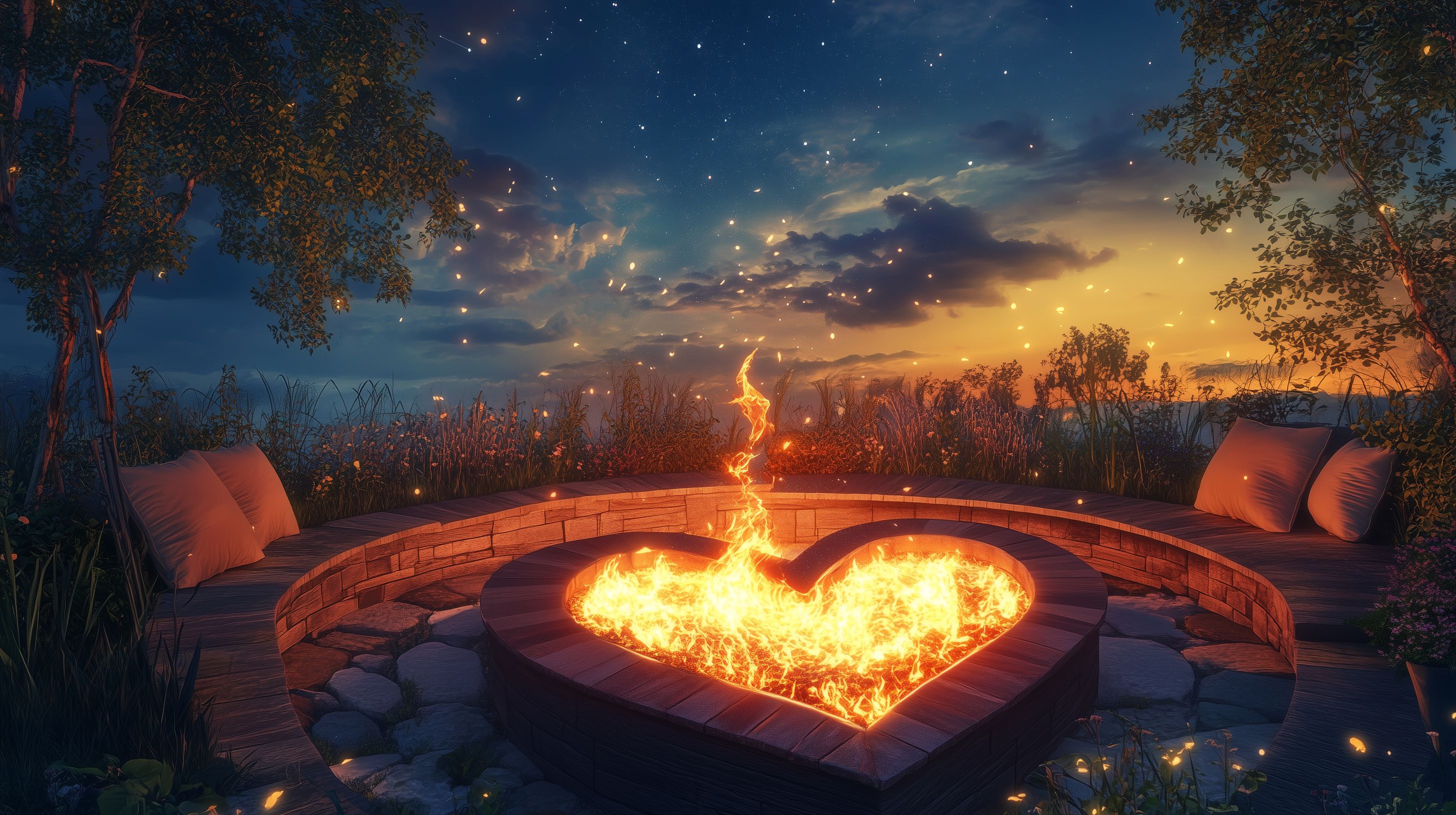 Dieses stimmungsvolle Bild zeigt eine herzförmige Feuerstelle am Ufer eines Sees bei Nacht. Das Feuer lodert intensiv und wirft ein warmes, oranges Licht auf die Umgebung. Um die Feuerstelle herum befinden sich bequeme Sitzkissen, die zum Verweilen und Entspannen einladen. Der dunkle Nachthimmel ist mit unzähligen Sternen übersät, die das Bild zusätzlich verzaubern. Diese romantische Szene eignet sich hervorragend als Hintergrundbild für Webseiten, Blogs oder Social-Media-Posts zum Thema Natur, Camping oder Outdoor-Freizeit. Als kostenloses Stockfoto in hoher Auflösung und unter Creative-Commons-Lizenz kann es vielfältig eingesetzt werden.