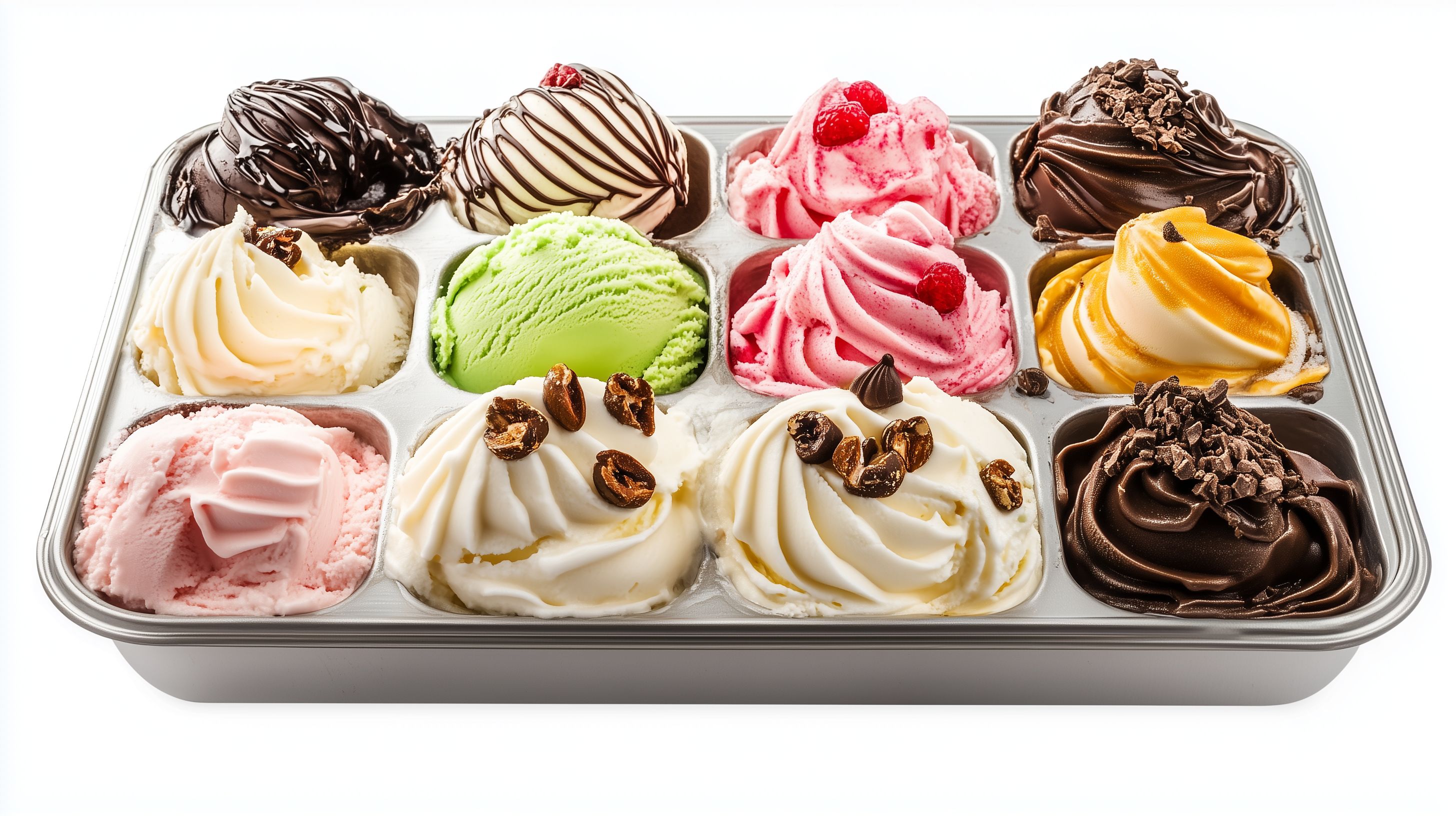 Das Bild zeigt eine bunte Auswahl an verschiedenen Eissorten und Toppings in einem Eisbecher. Zur Auswahl stehen zahlreiche Geschmacksrichtungen wie Schoko, Erdbeer, Vanille, Pistazie und weitere. Die Eisportionen sind kunstvoll angerichtet und mit dekorativen Elementen wie Schokoladenstreuseln und Früchten garniert. Das Foto bietet ein appetitliches, farbenfrohes Motiv, das sich ideal für die Verwendung in Blogs, Newslettern oder Werbematerialien zum Thema Essen und Genuss eignet. Dieses hochauflösende Stockfoto steht unter einer Creative-Commons-Lizenz zur Verfügung.