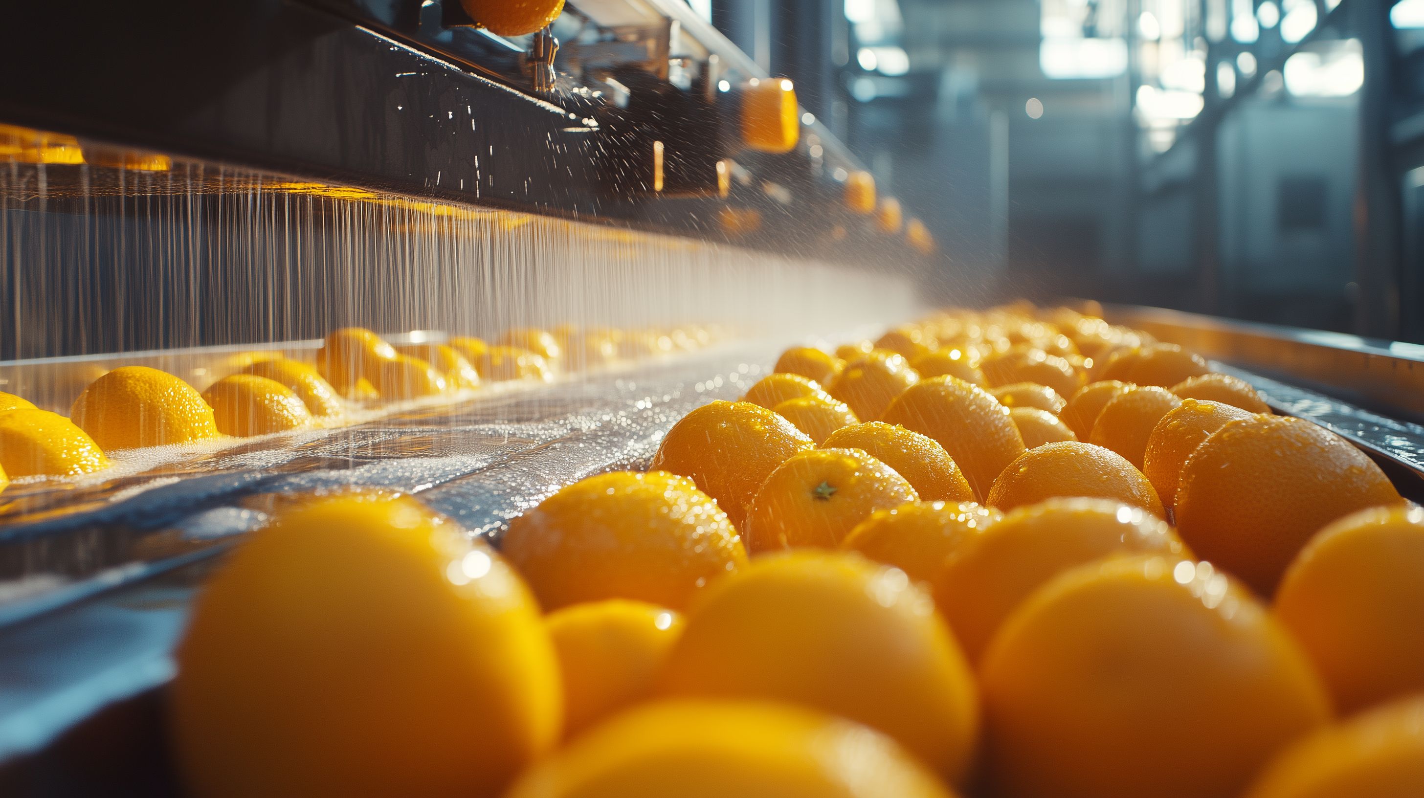 Dieses Foto zeigt eine Produktionsstraße in einer Fabrik, auf der frische Orangen gewaschen werden. Die orangefarbenen Früchte liegen dicht an dicht auf dem Förderband und werden von oben mit Wasser besprüht, um sie von Schmutz und Rückständen zu reinigen. Die intensive Farbe und der glänzende Glanz der Orangen verleihen dem Bild eine lebendige, appetitanregende Ausstrahlung. Das Motiv eignet sich hervorragend als kostenloses Stockfoto für Beiträge rund um Gesundheit, Ernährung, Lebensmittel oder Produktionsprozesse in der Industrie. Die hochauflösende Qualität und die Creative-Commons-Lizenz machen das Foto zu einer praktischen und vielseitigen Ressource für verschiedene visuelle Kommunikationskanäle.